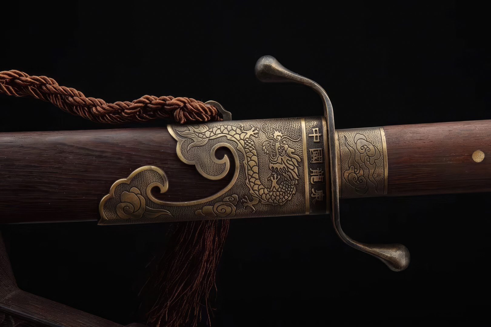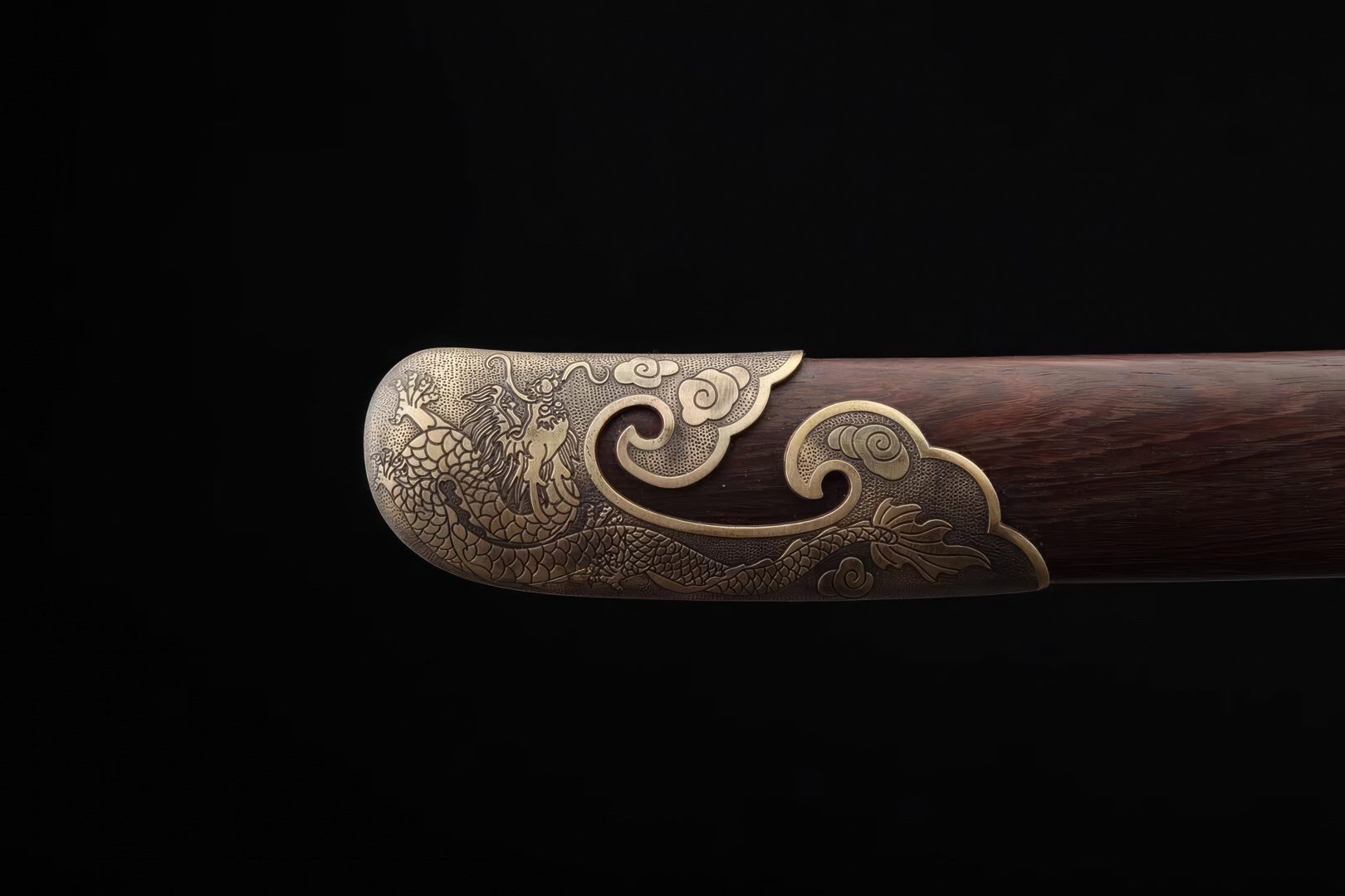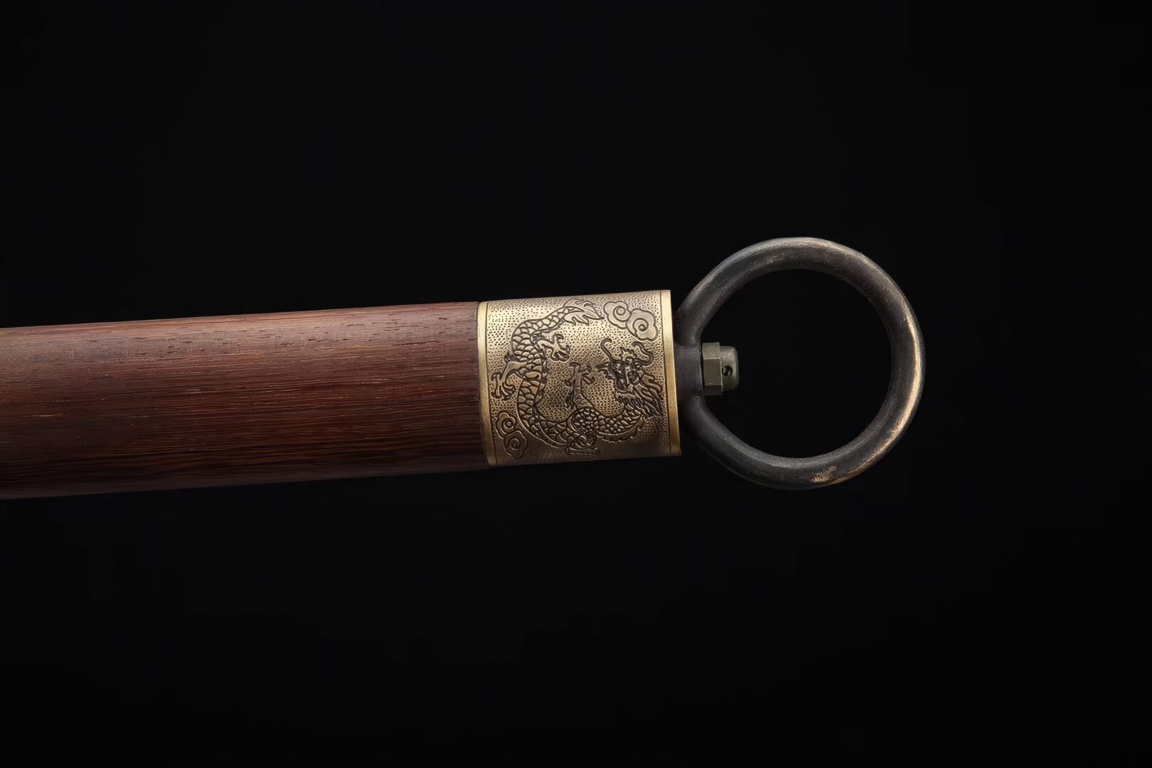 The fittings, made of brass, feature the Chinese Tai Chi Dragon motif, complemented by a beautiful Huali wood scabbard. The handguard boasts an S-shape, incorporating a traditional Chinese ring pommel, perfect for adding a lanyard. Ideal for decor or practicing the vigorous Chinese Wushu arts, this sword comes with a safe and highly flexible blade.