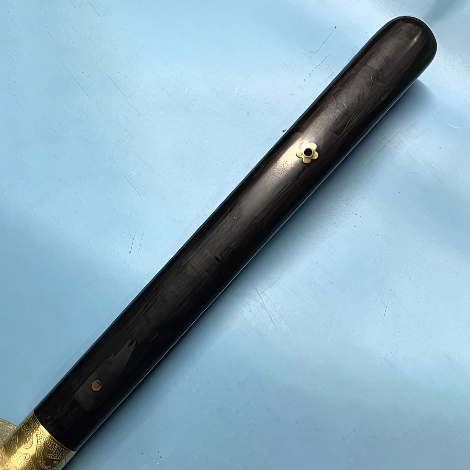 Forged from Tamahagane steel and clay tempered, the full tang blade has a beautiful hamon that is made prominent after being mirror polished by hand. It features fully hand engraved brass fittings along with a handle and scabbard made of ebony wood. Having spared no expense, this luxury Miao Dao is a masterpiece in terms of quality and appearance.