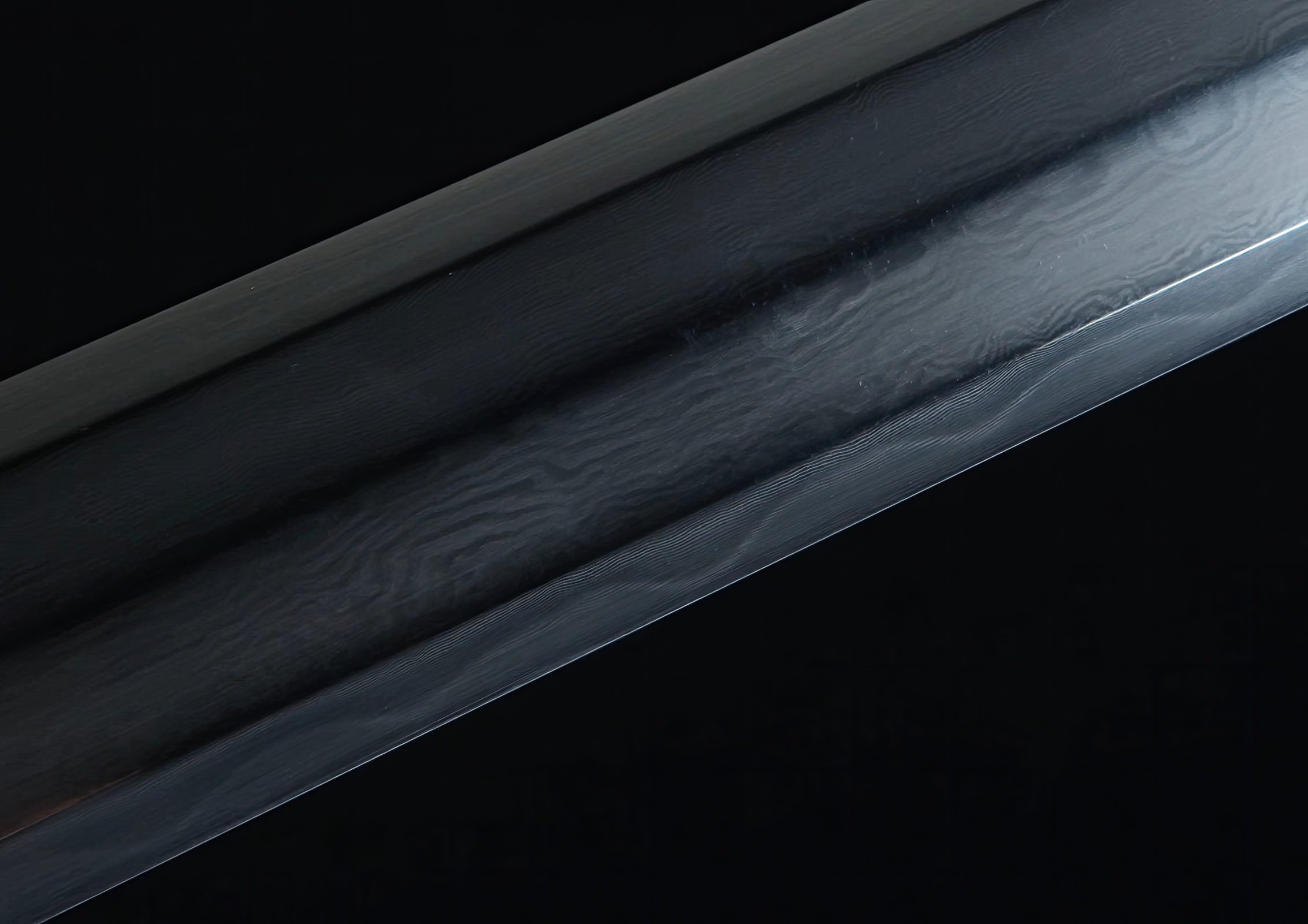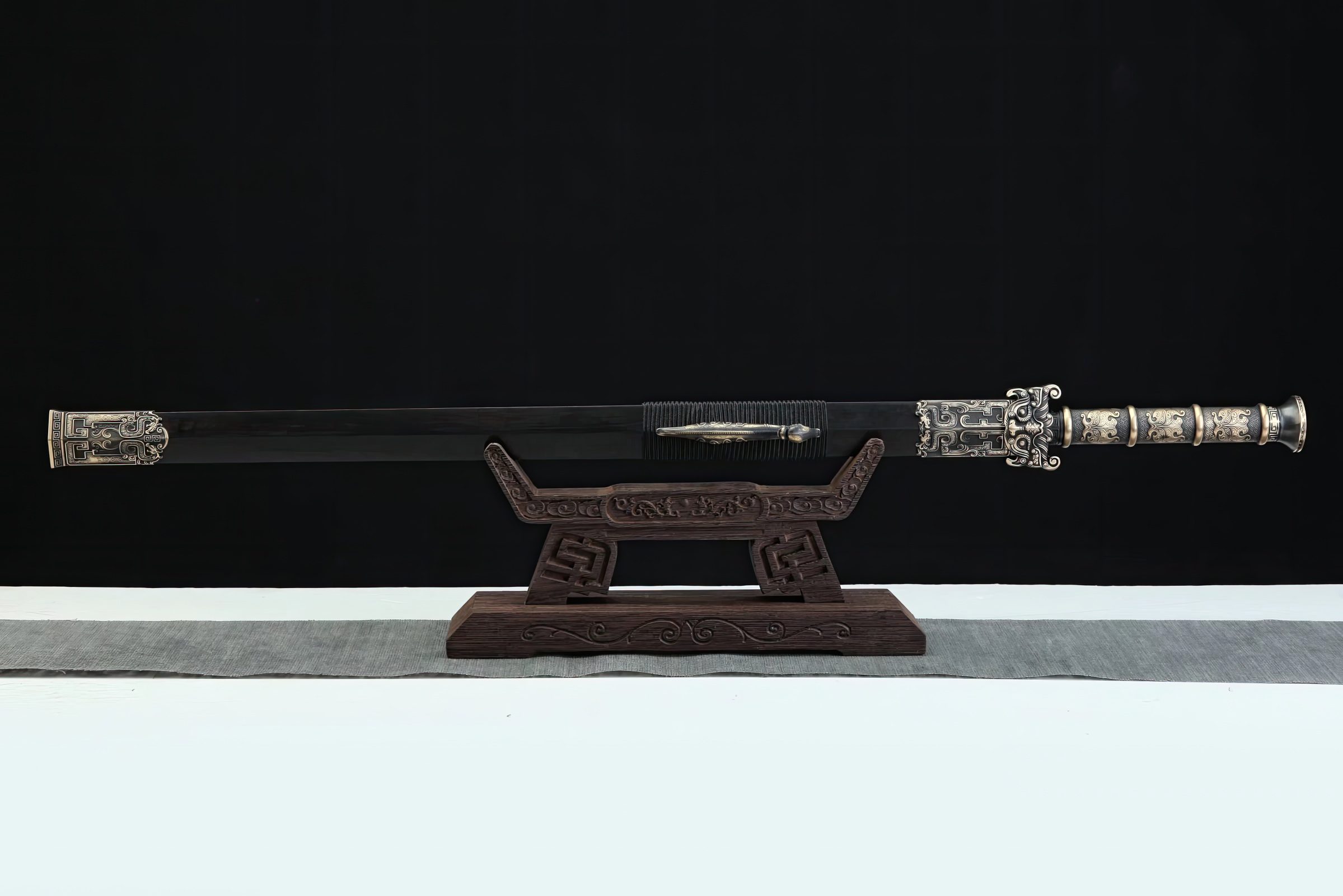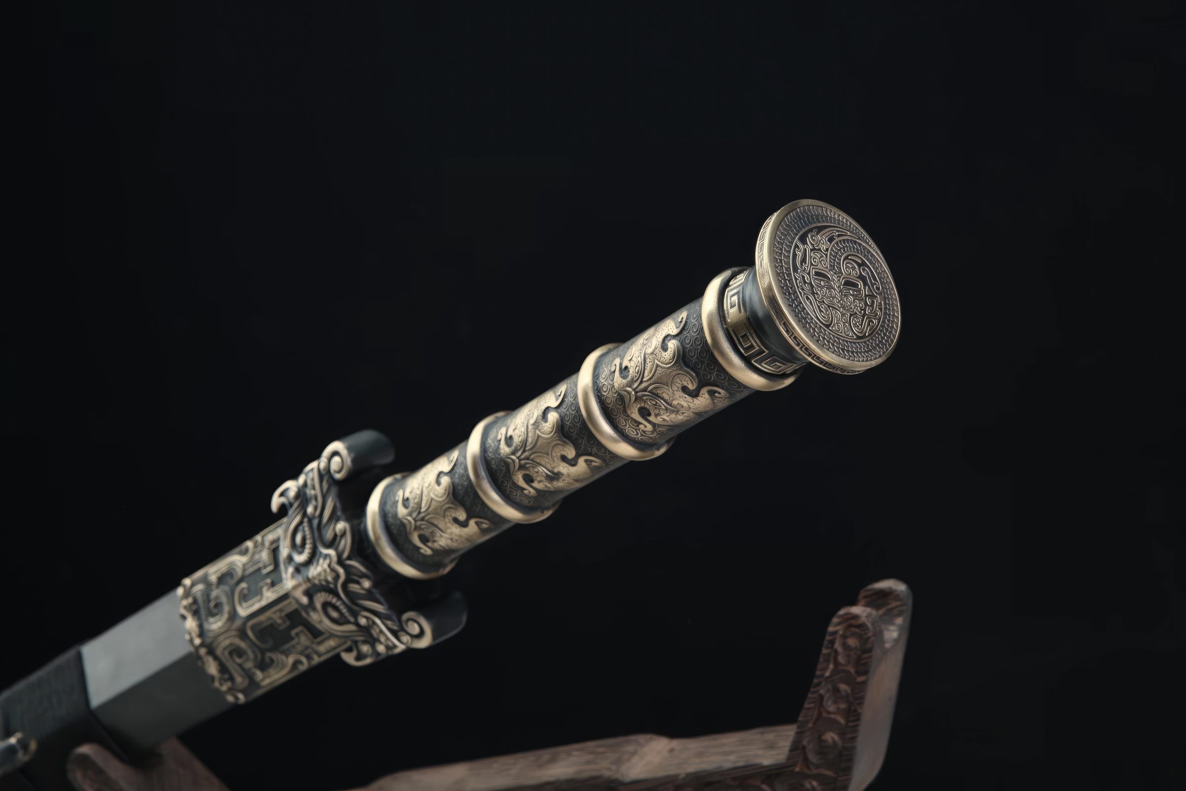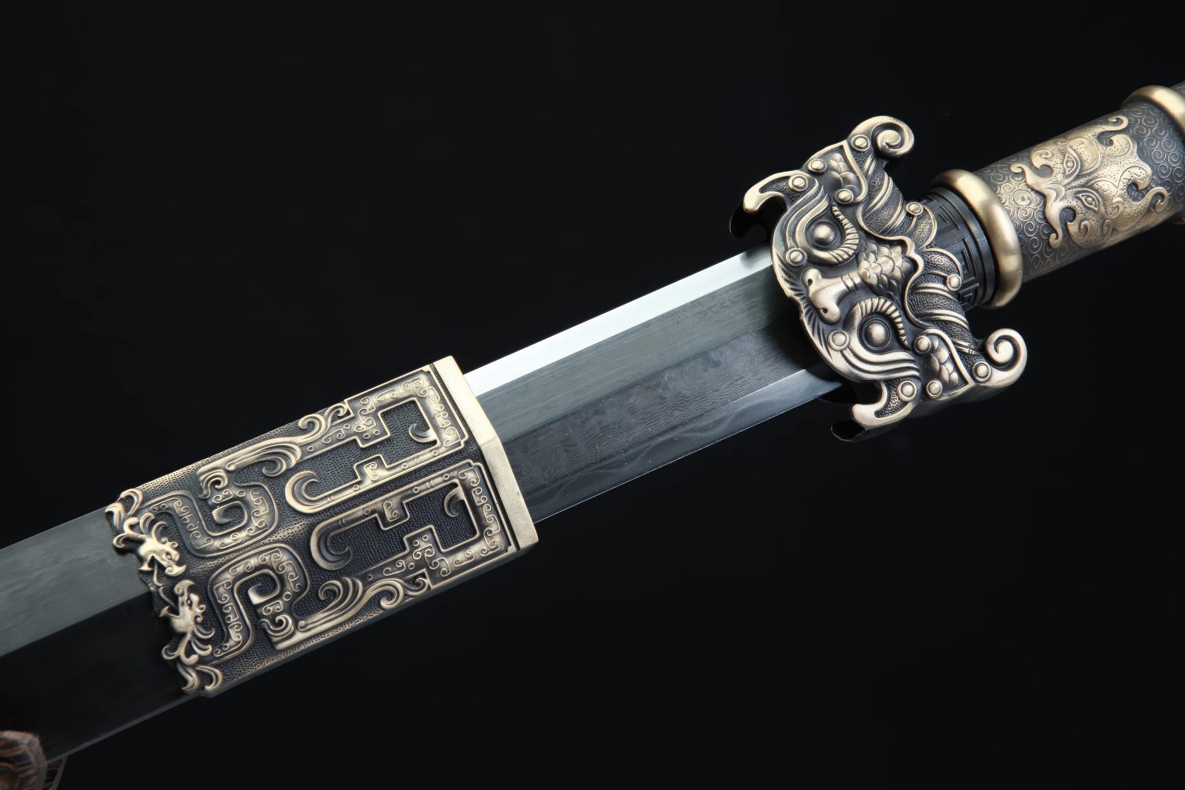 This beautiful Jian double-edged sword, featuring the Chinese flying dragon as its main theme and motif, is aptly called the "Flying Dragon Han Jian". Patterned after blades used during the Han Dynasty (202 BCE - 220 CE)—some of the earliest functional steel Chinese blades—this weapon is constructed from pattern and 1095 folded steel, creating numerous Damascus-like layers visible along its length.