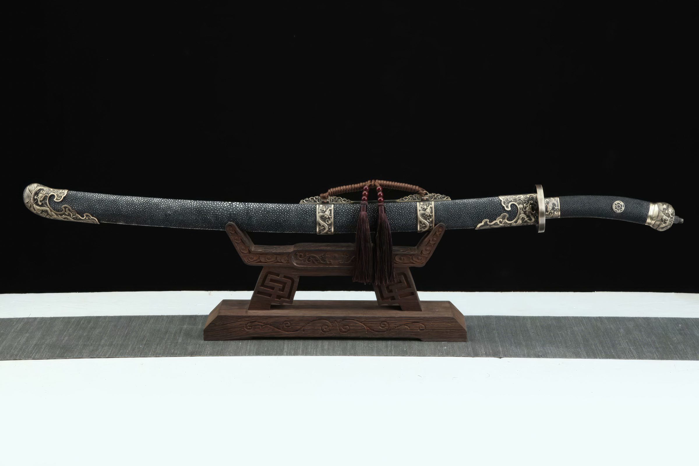 Its fittings, constructed out of copper, are enriched with a traditional Chinese dragon motif symbolizing power, courage, luck, and wisdom. The handle is crafted from wood and fully wrapped in high-quality rayskin. The blade is polished with hazuya stones, creating a mirror-like shine, ideal for decor, or an extremely sharp edge perfect for cutting tests. Optional engraving is available, and the sword comes with a complimentary sword bag.