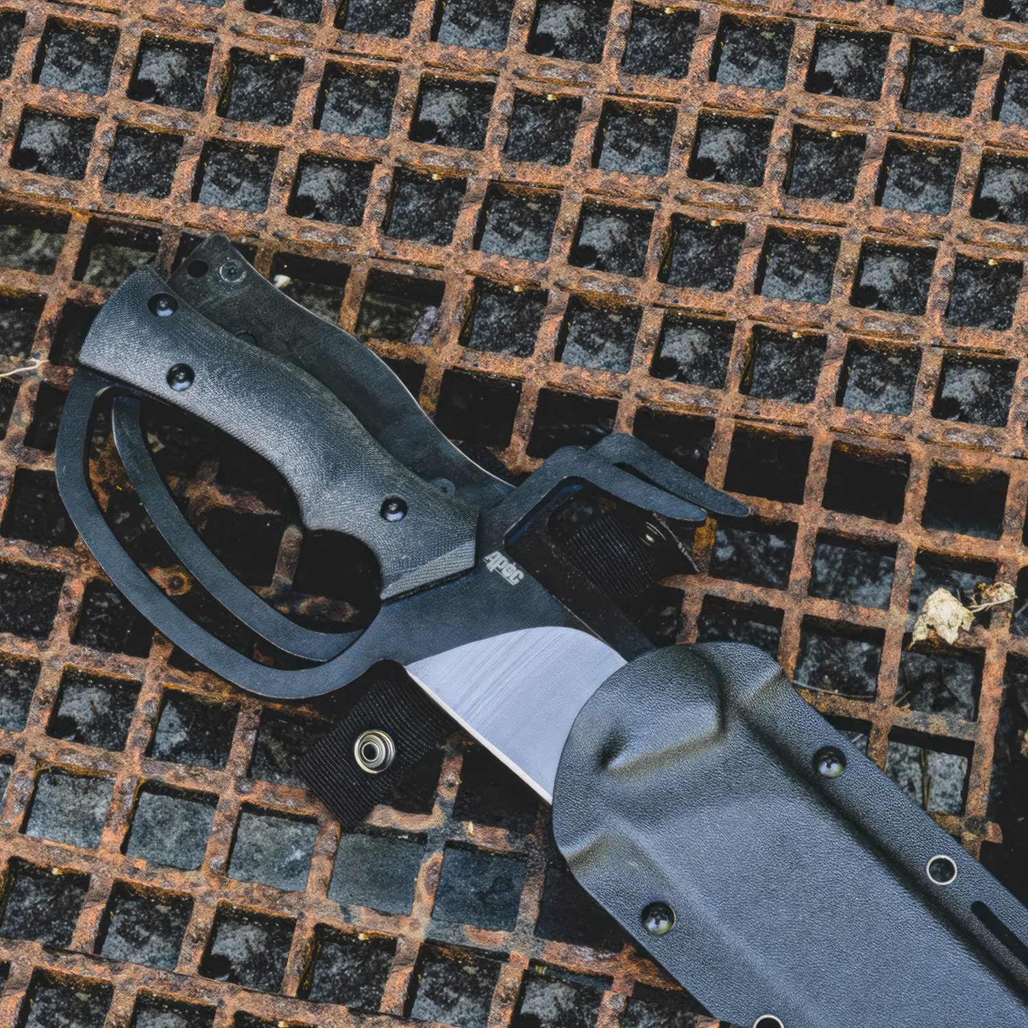 With a swift draw from the Molle compatible Kydex sheath, the twin blades, forged from resilient 9260 steel, spring to life. The 10 5/8" black-coated blades feature a "a la Moy Yat" profile, designed for precision strikes. The comfortable G-10 handle slabs and protective guard ensure a secure grip. Weighing 2 lbs 5 oz, these Butterfly Swords offer a deadly combination of power and agility.