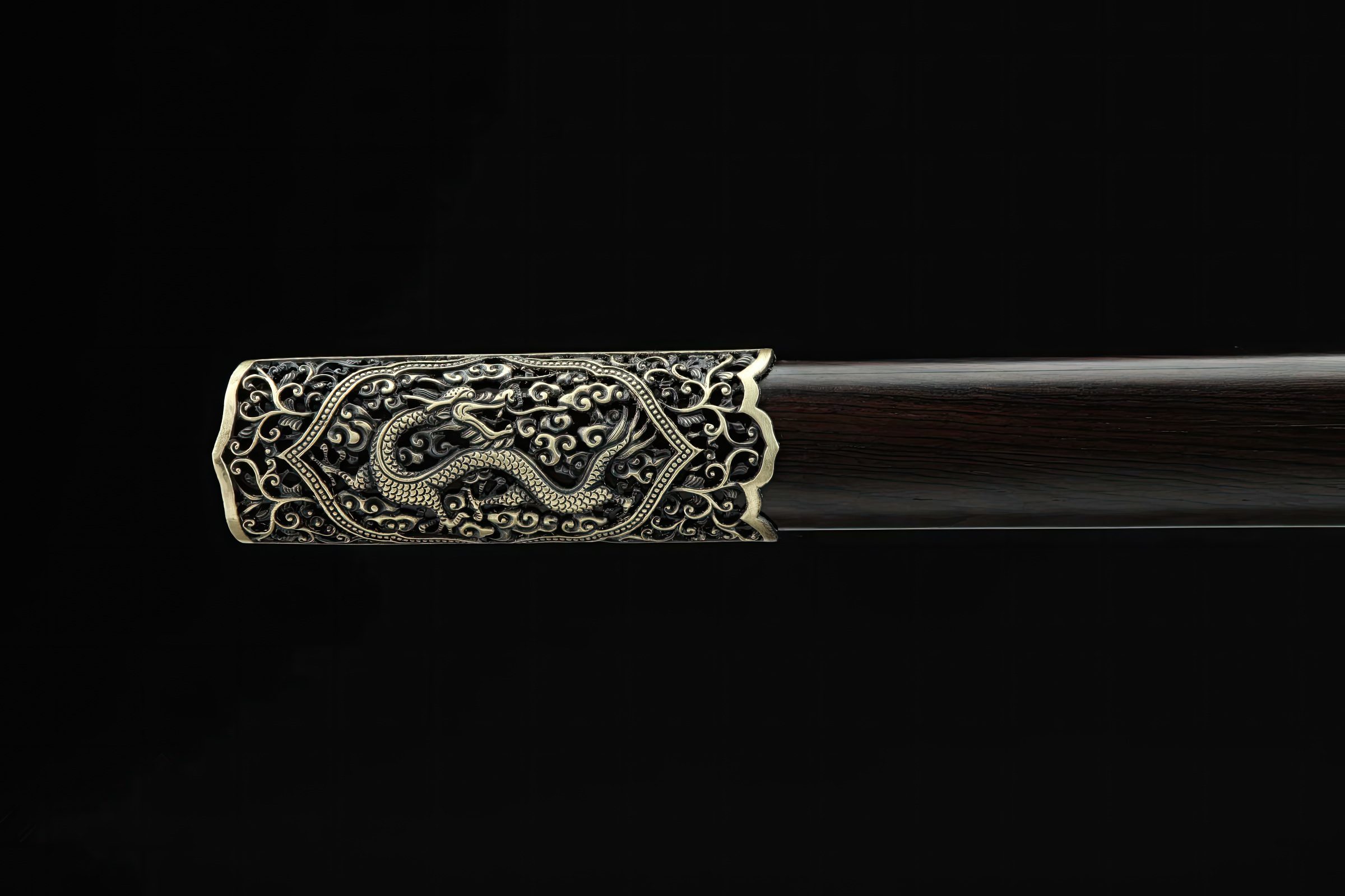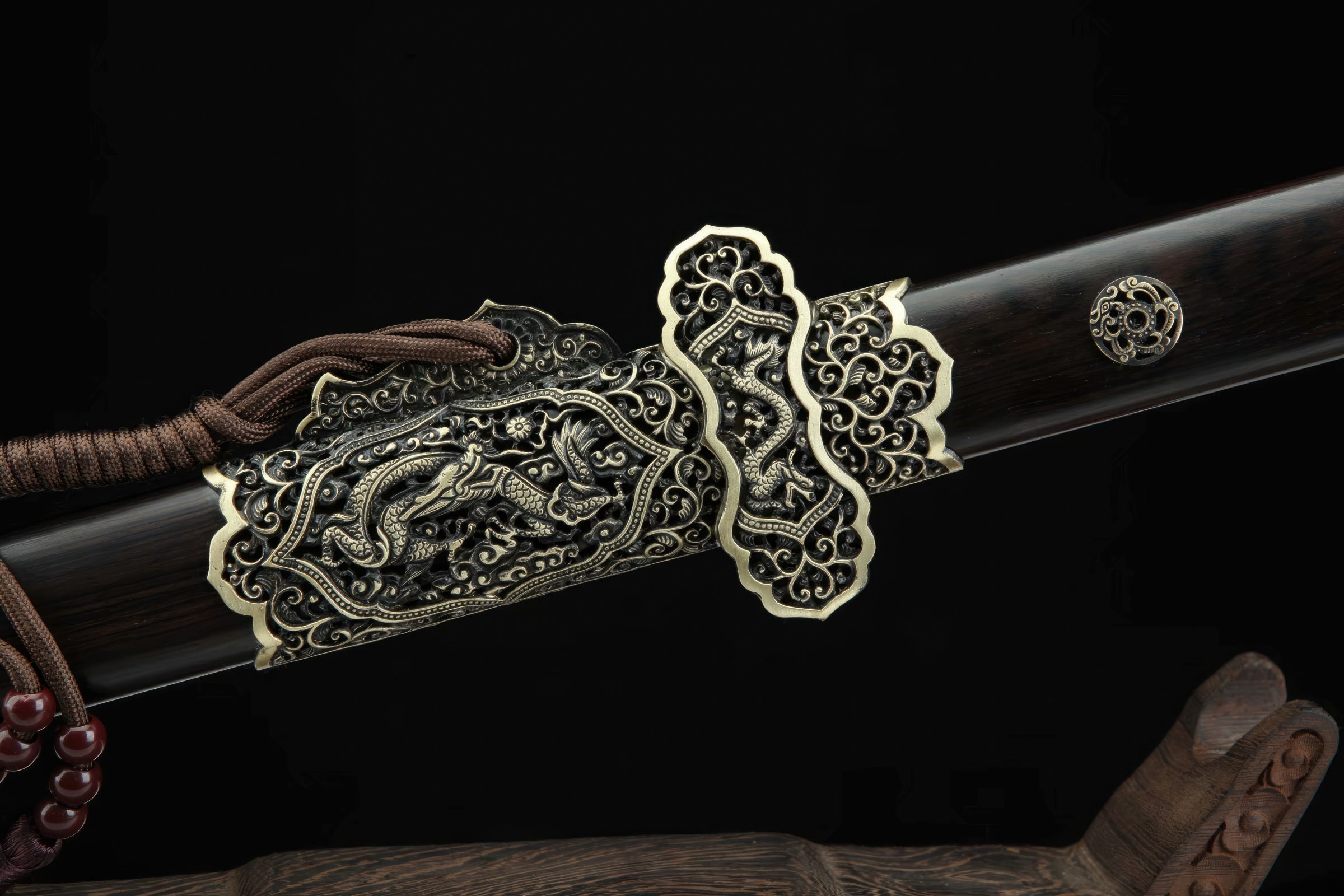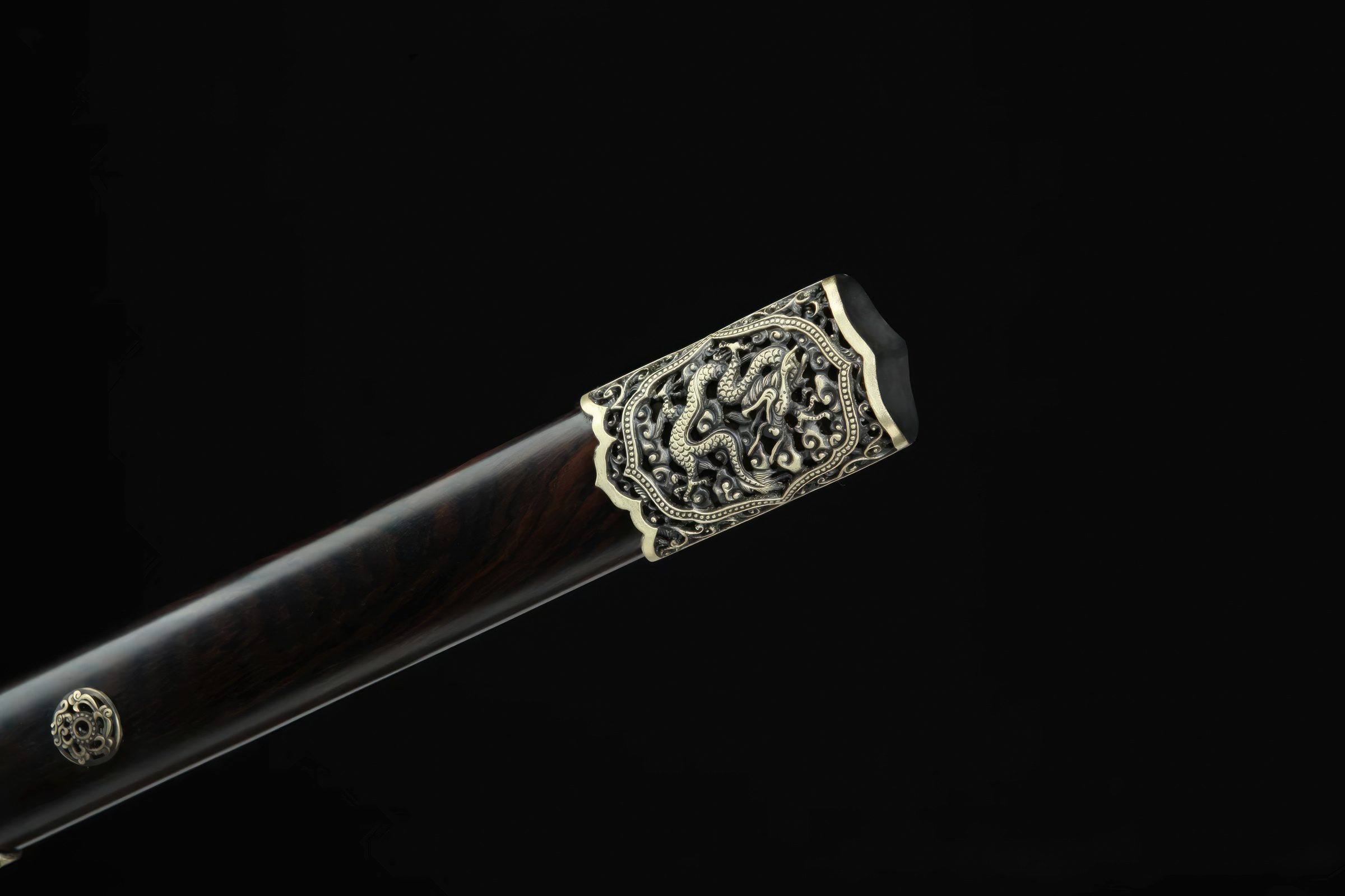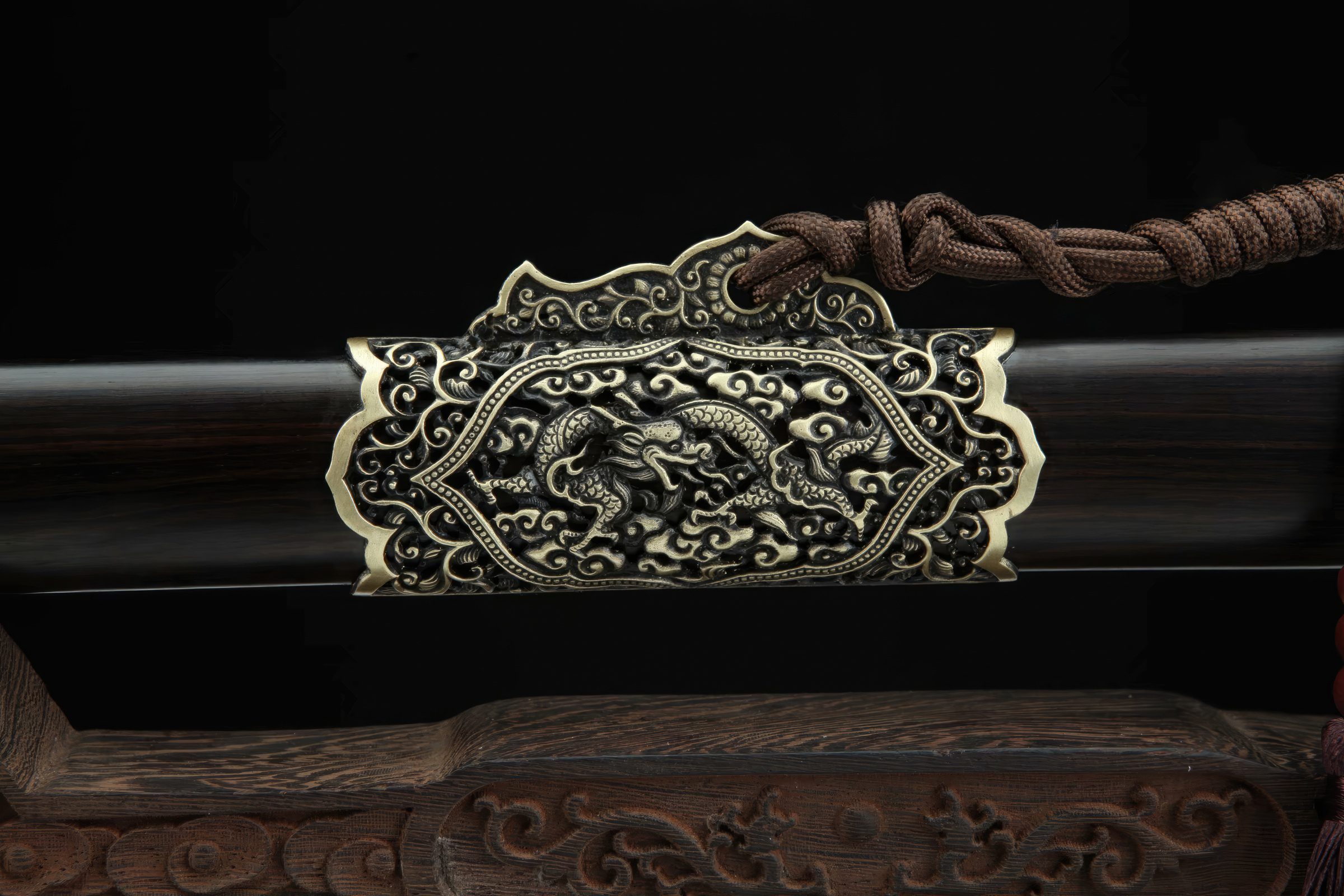 The weapon comes with an ebony wood scabbard and a hardwood two-handed handle. The copper and brass fittings feature emblems from the Tang Dynasty and symbols of the Chinese dragon.