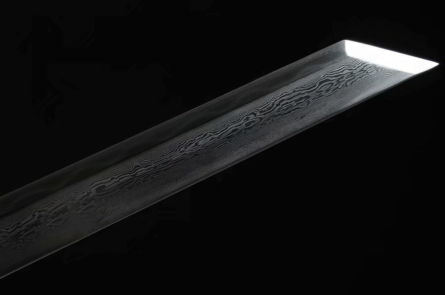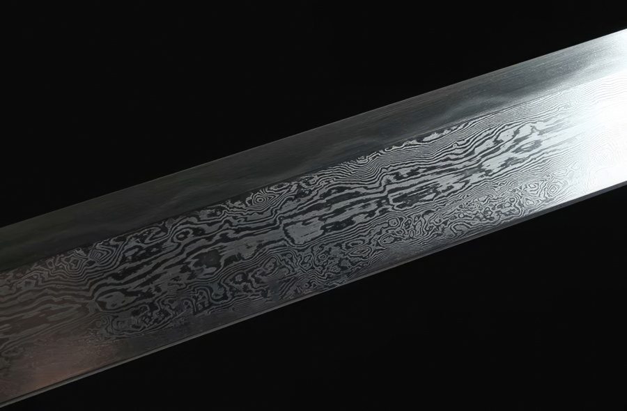 The tang dao has a folded pattern steel blade with several visible layers and patterns. The blade is polished using hazuya, oil quenched, and differentially heat treated for a harder edge and more flexible spine.