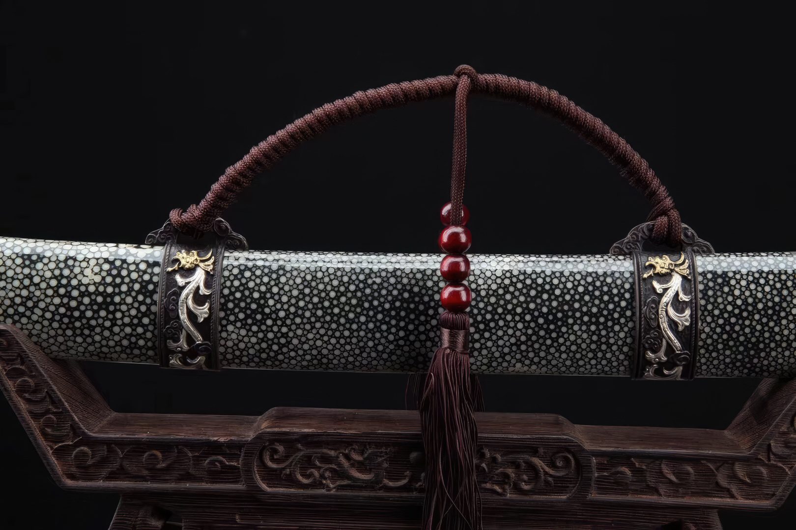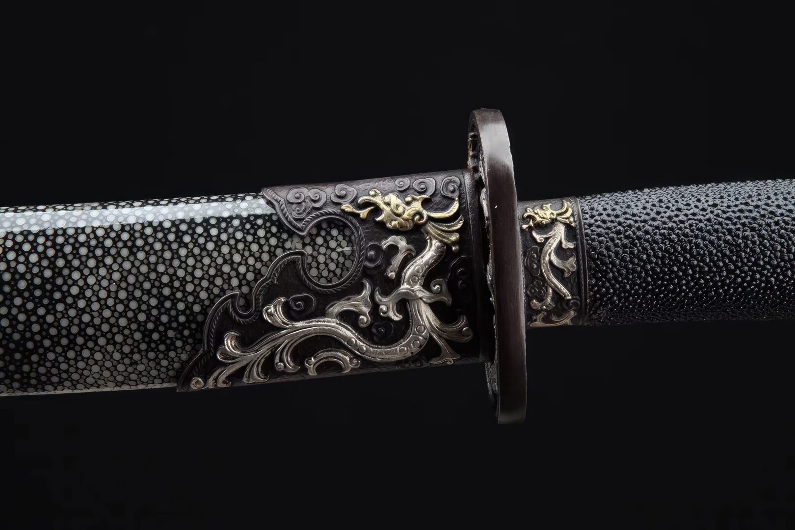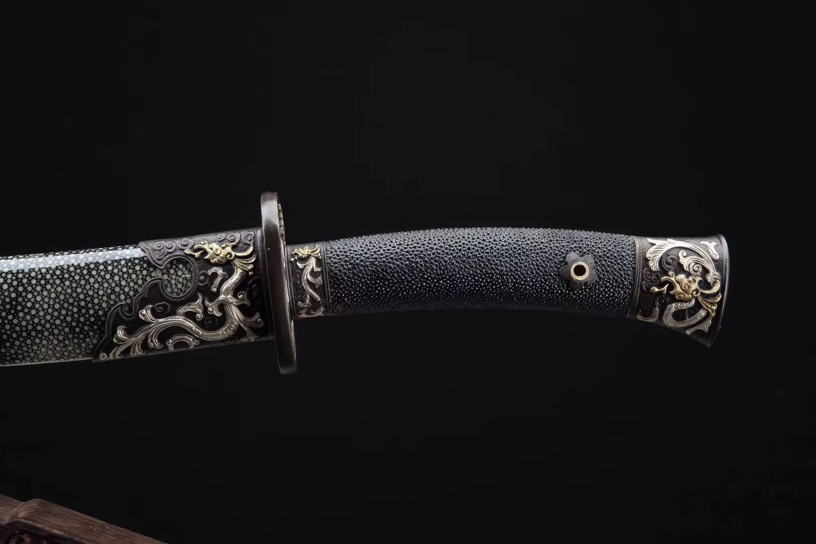 The distinctive hamon patterns are highly noticeable, and the blade contains a groove to lighten its weight, enhancing its handling qualities. All the fittings are crafted from brass, reflecting a prevailing dragon theme design. The scabbard and handle are constructed from wood and are covered with genuine rayskin material. Ideal for cutting practice, the sword comes with a complimentary sword bag for storage purposes.