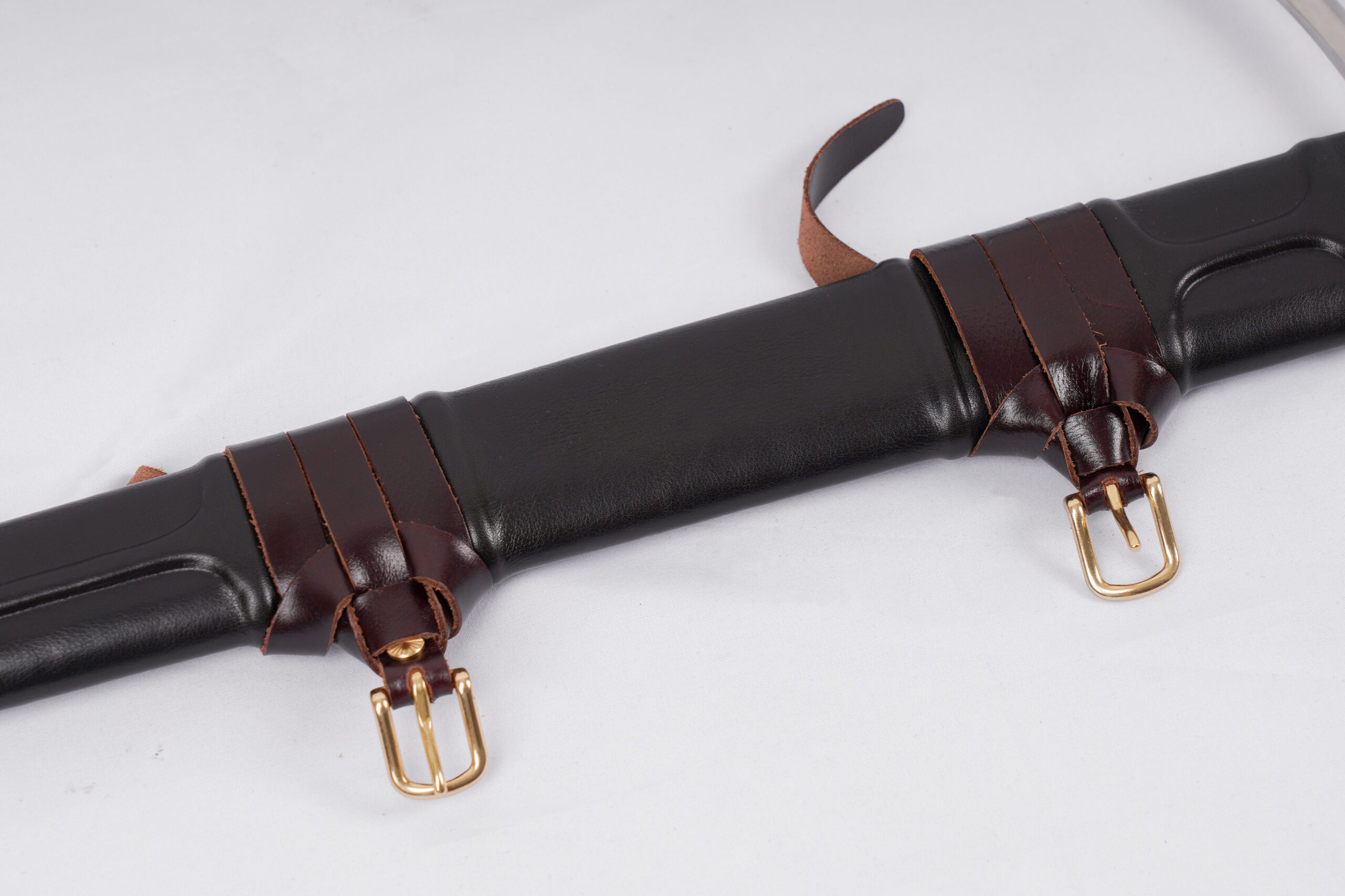The wood-cored scabbard is wrapped in black leather with a rain-guard at the throat and a metal chape. A two-point suspension (double-buckle hanger) uses dark bridle-leather belt bridges and billets, paired with lighter chestnut / saddle-tan straps and gold-plated buckles for a warm, premium contrast.