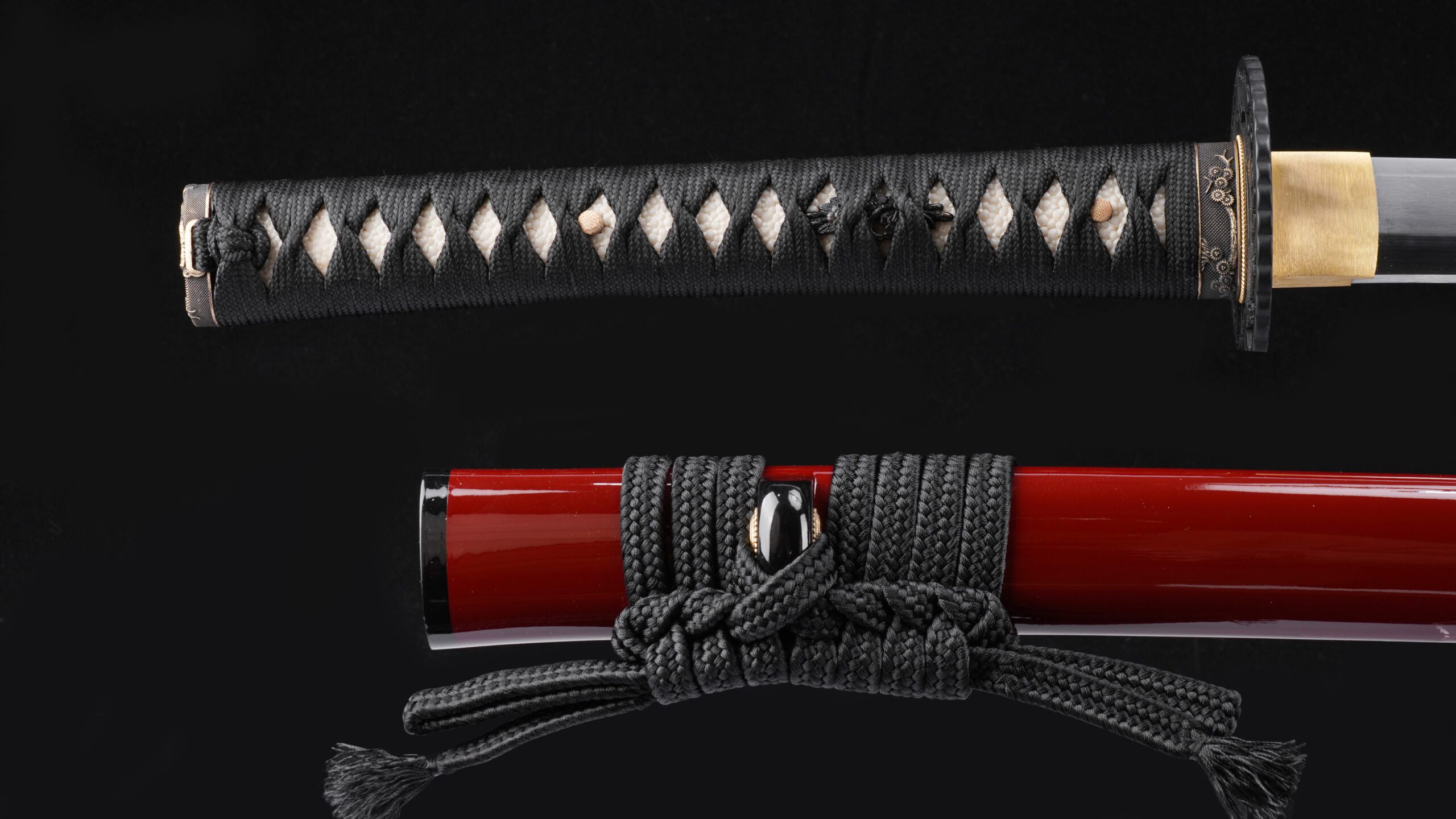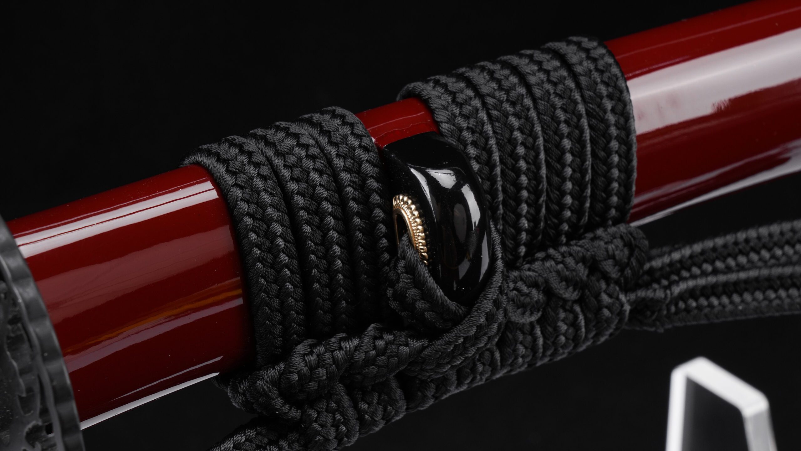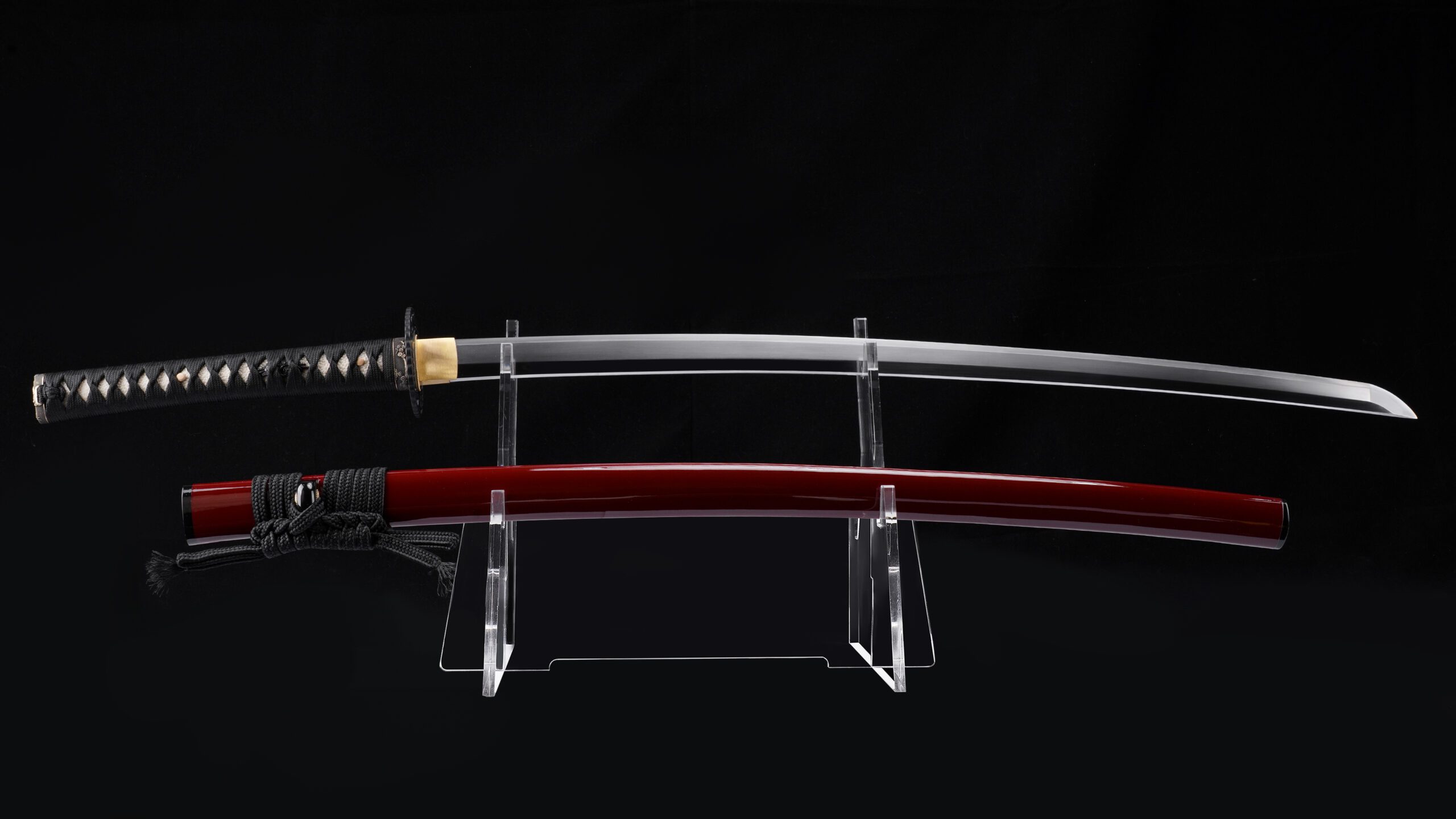 The overall design of the katana is completed with an oil lacquered saya mounted with brass shitodome and thick sageo.
