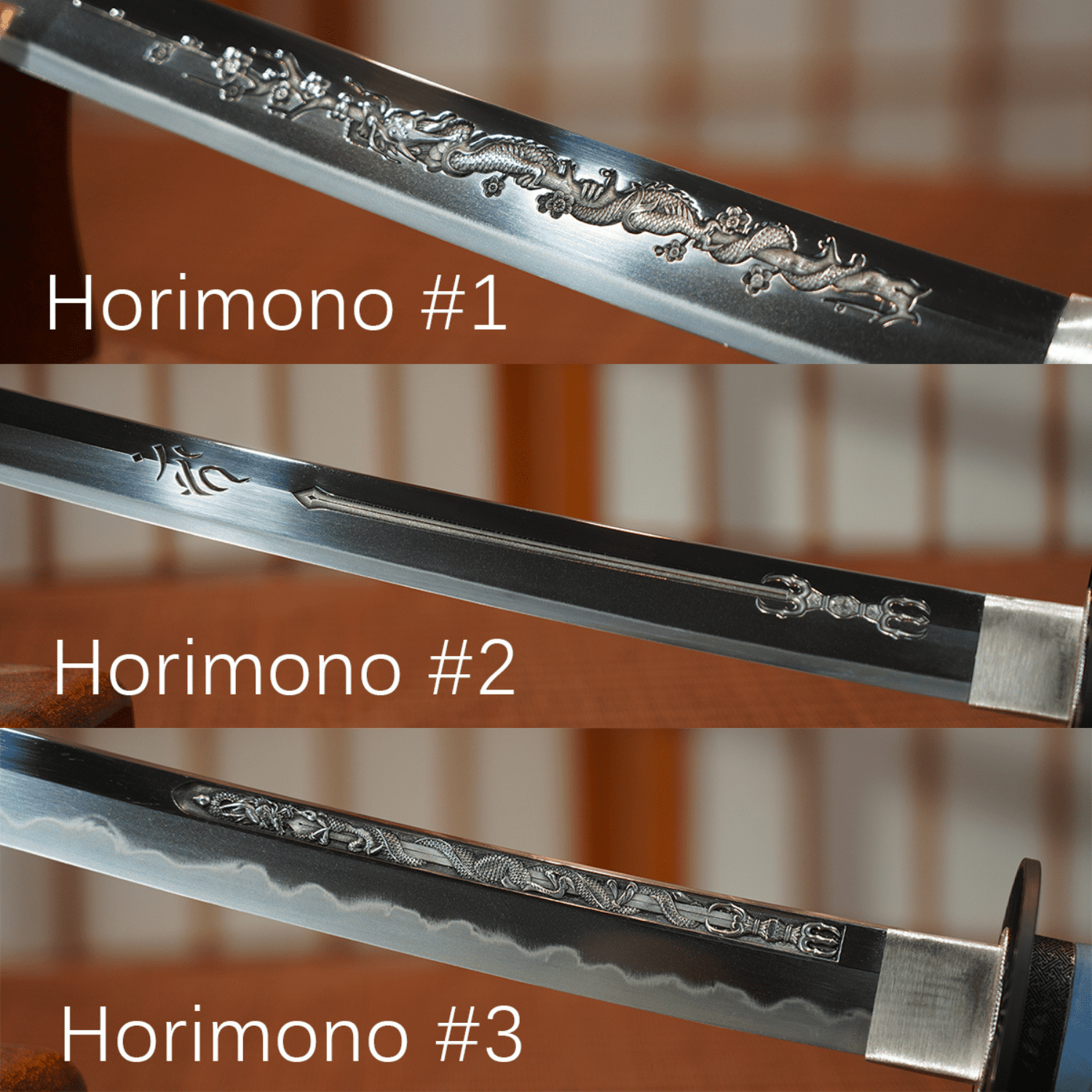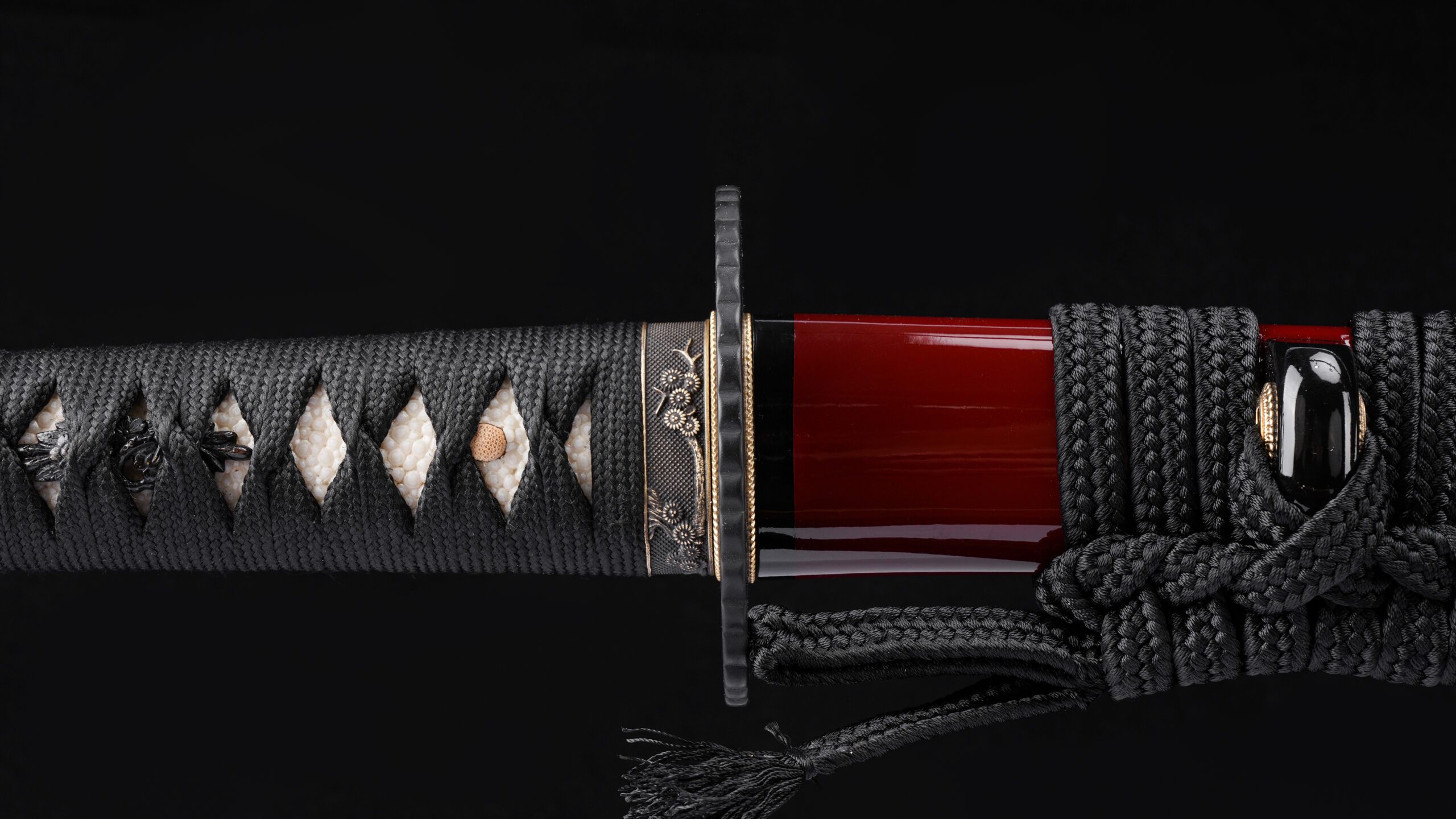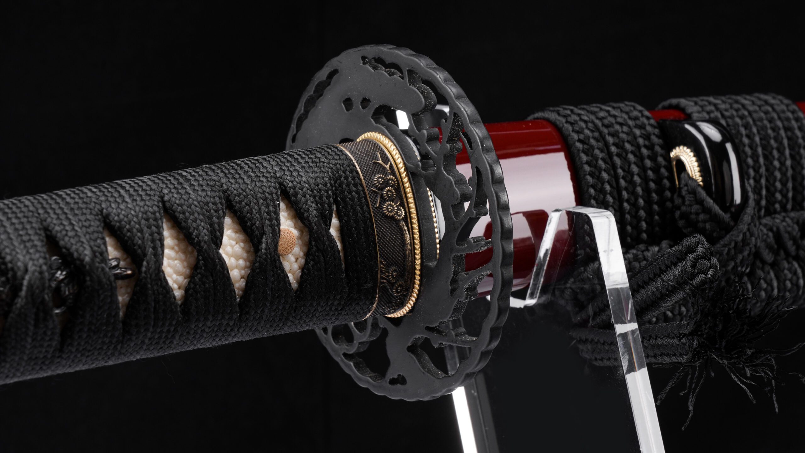 It is then equipped with an iron maru gata (round) tsuba and brass fuchi Kashira that features ornate designs. It also comes with a brass menuki along with brass seppa and habaki. The Haichi style tsuka is first inlaid with white genuine samegawa and wrapped with artificial silk ito. The handle can include hishigami, small folded paper triangles placed under the tsuka-maki wrap to uphold its shape and provide a firmer grip.