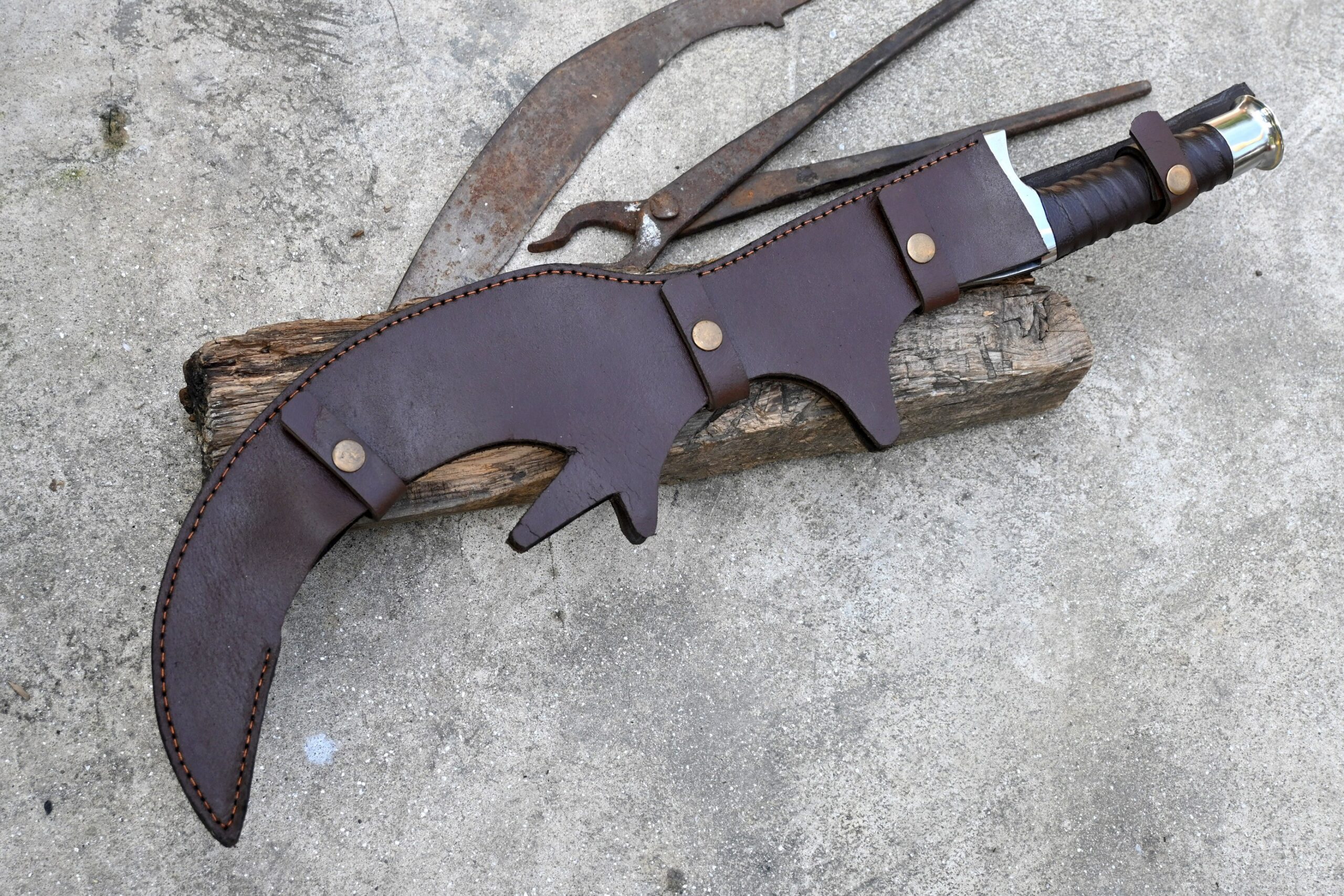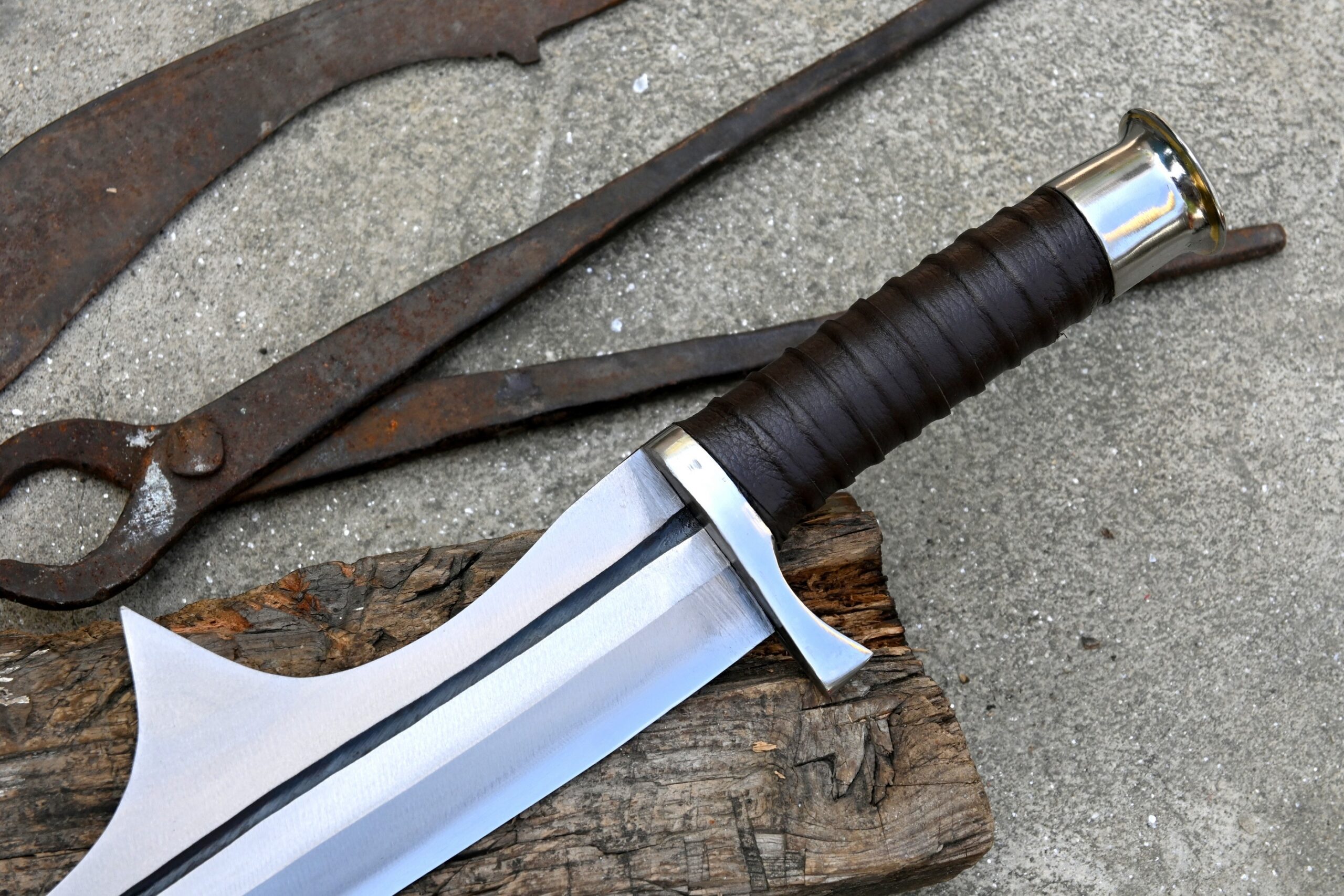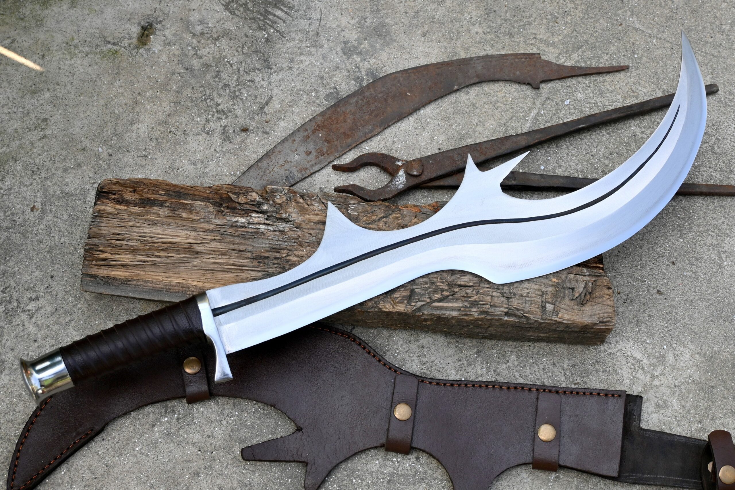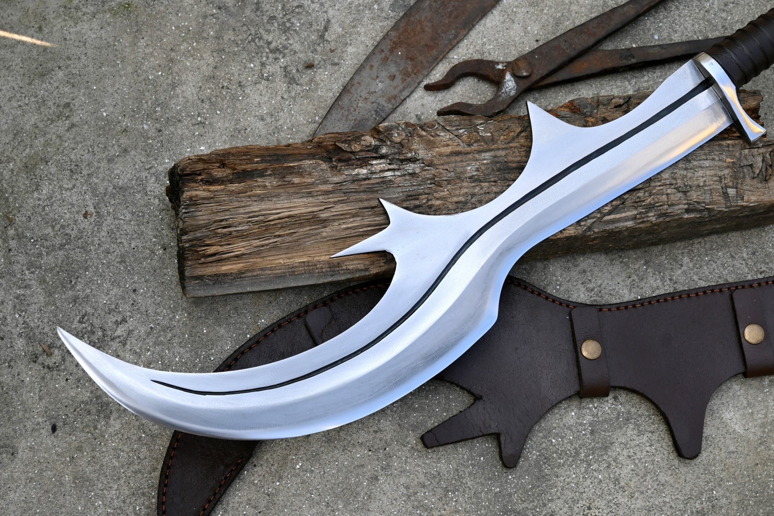The handle is made from rosewood, designed with finger notches for improved grip and comfort, and features a small protective guard. A leather scabbard specifically designed to fit the sword’s unique shape is included.