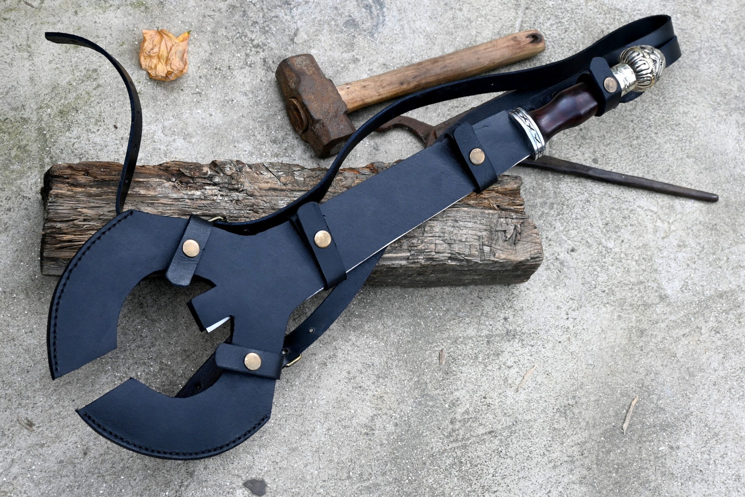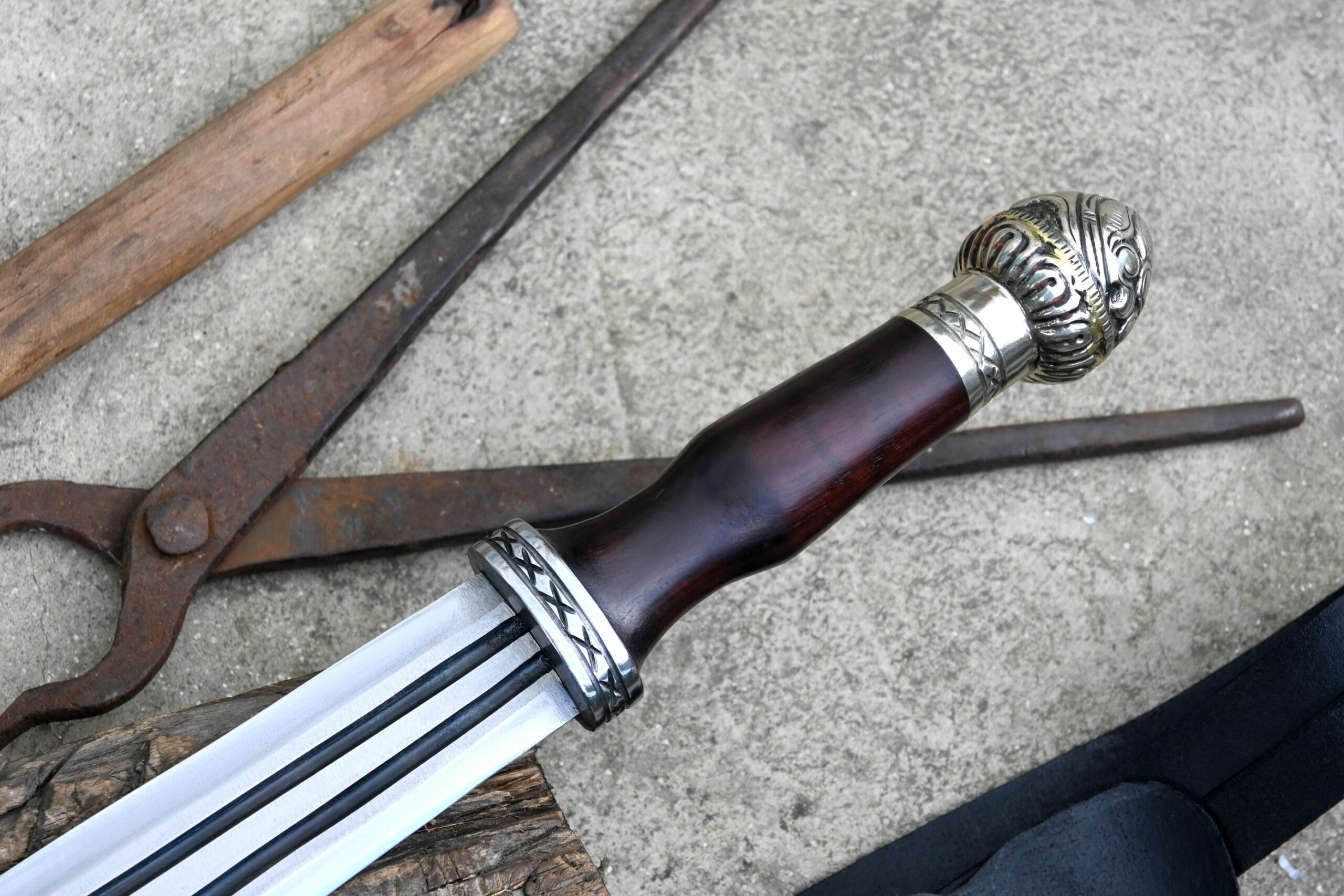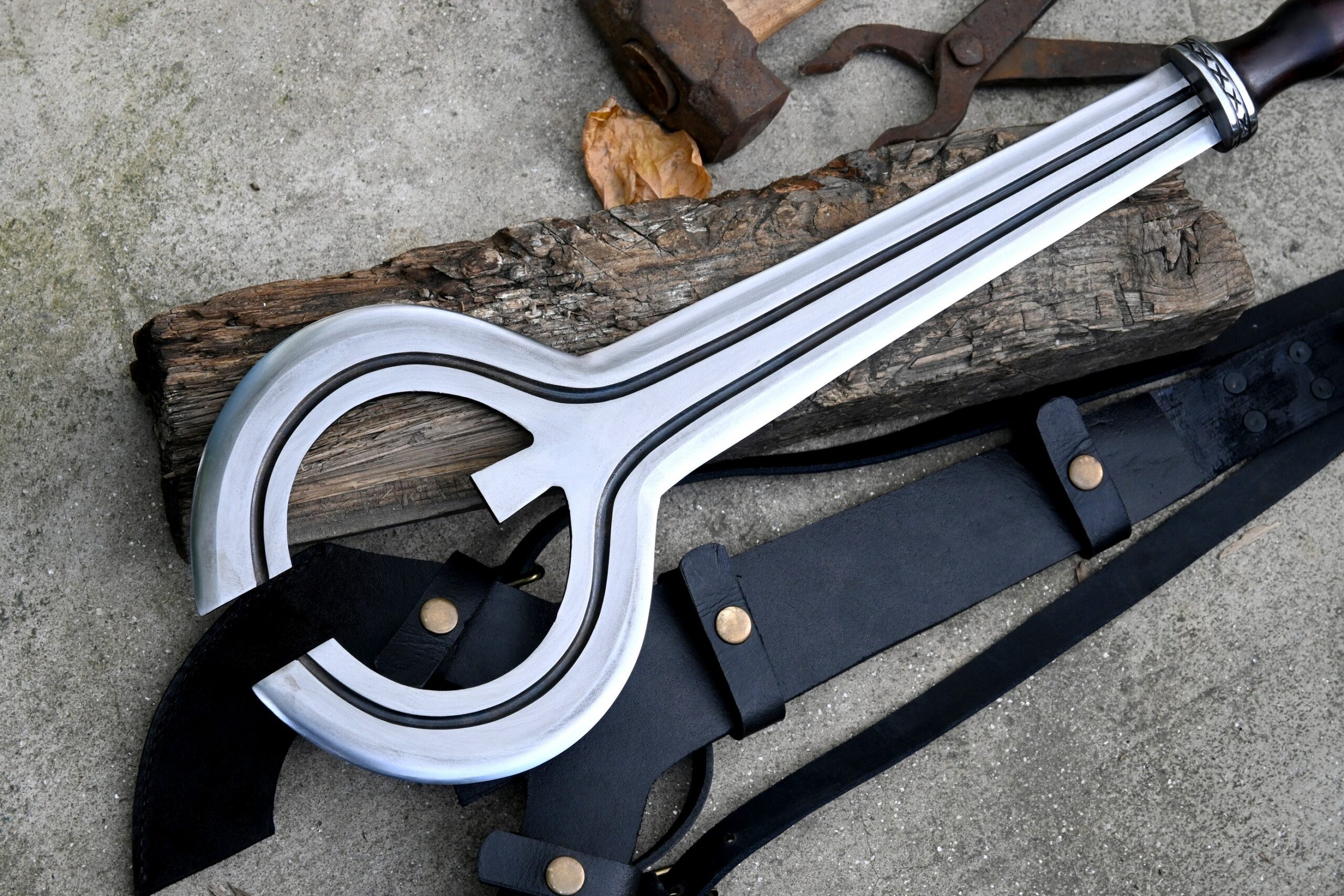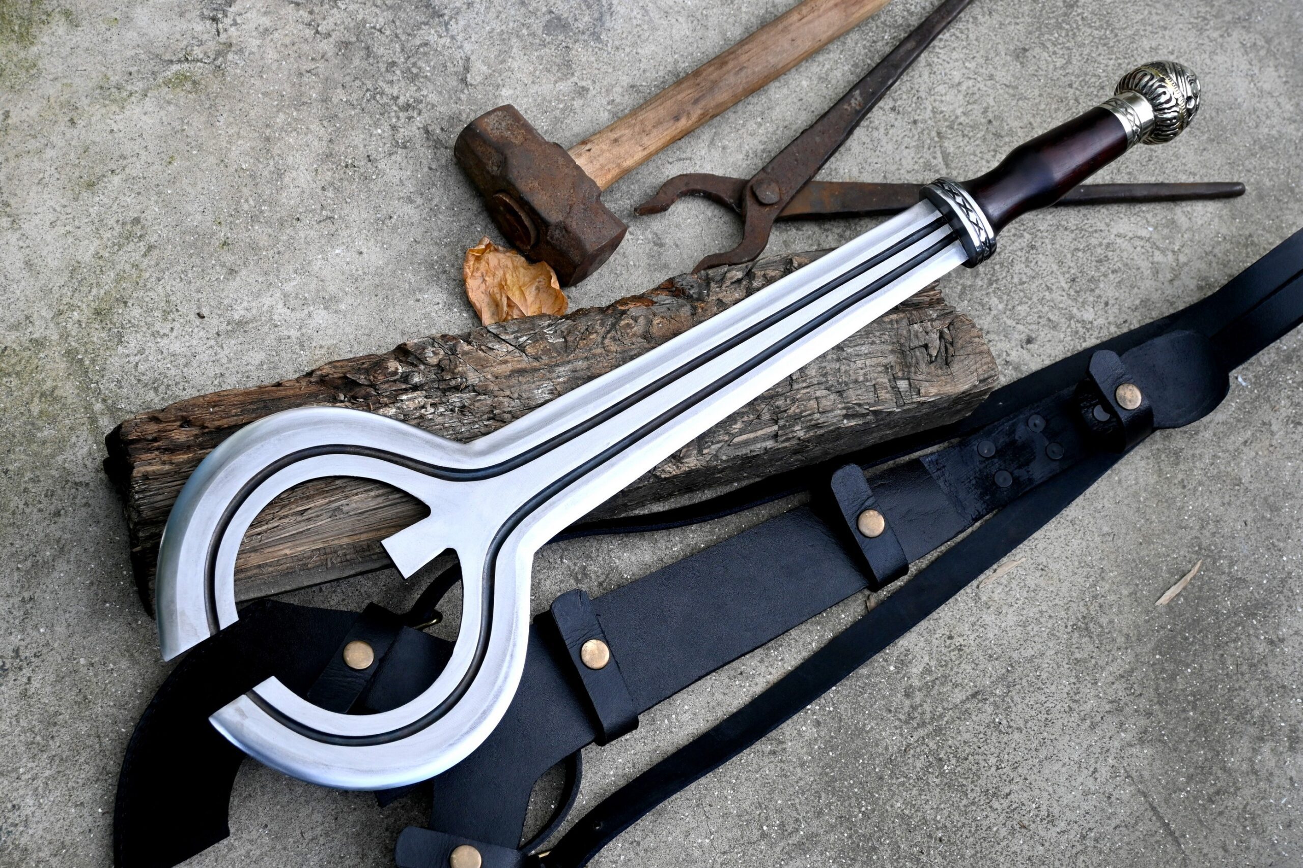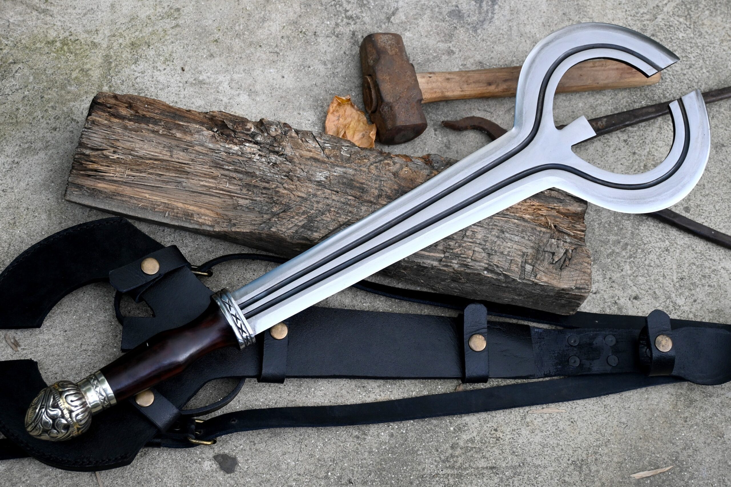 The handle is authentically fashioned from robust rosewood and complemented by decorative fittings, providing both elegance and reliability. Each sword includes a custom-fitted leather scabbard, specifically designed to accommodate and protect the uniquely shaped blade.