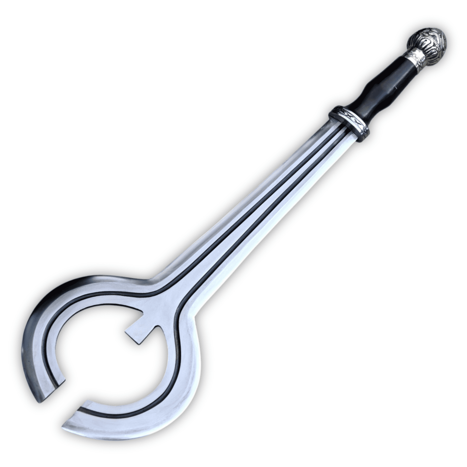 This replica is historically accurate and sharpened for light functional use, modeled closely after an original sword now preserved in a museum. Hand-forged from durable 5160 spring steel—highly regarded among sword enthusiasts for its resilience and flexibility—the blade features two distinctly sharpened sickle-shaped edges forming a near semi-circle.