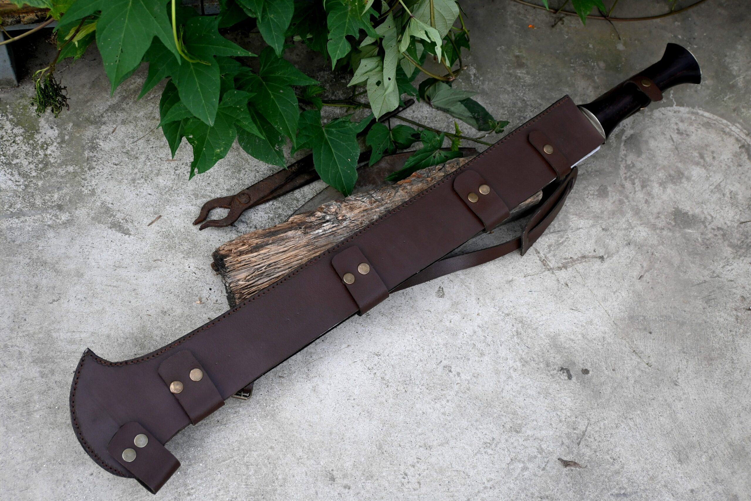 The hourglass-shaped handle is crafted from durable rosewood, providing both comfort and secure grip. The sword includes a custom-fitted scabbard specifically designed for its unique blade shape.