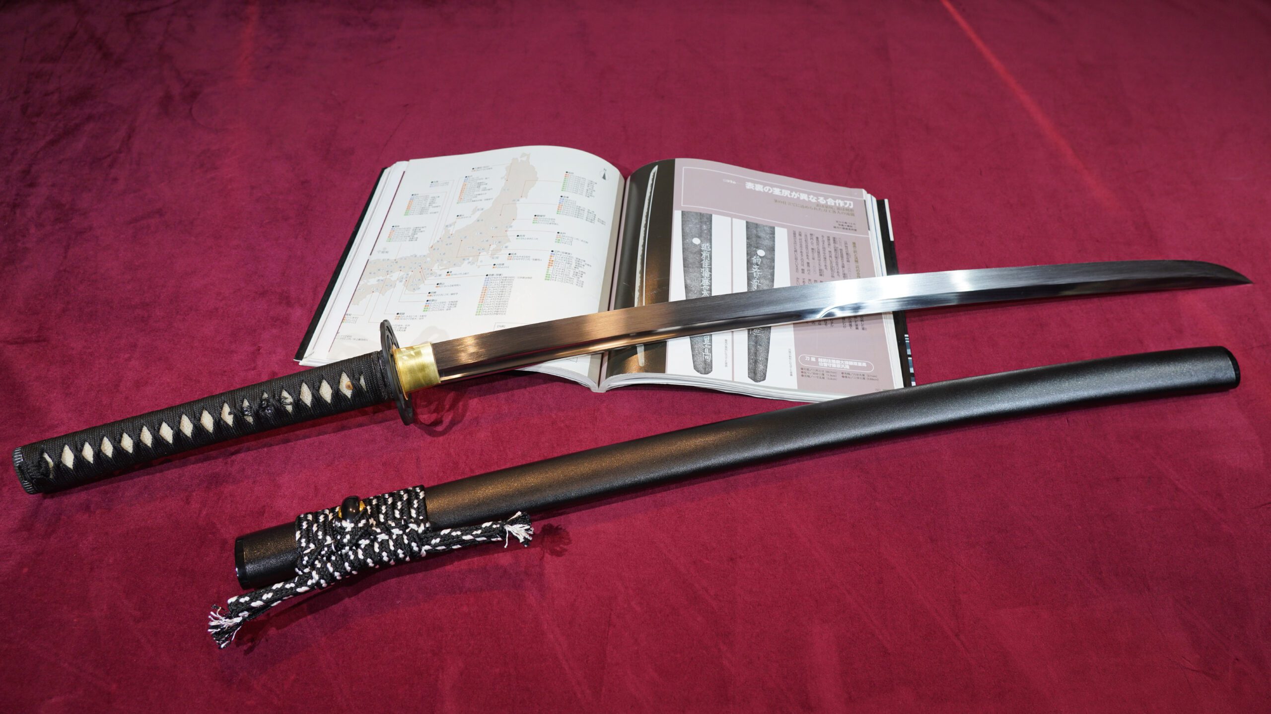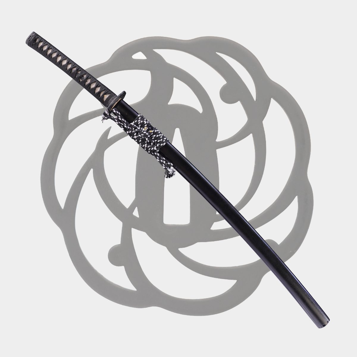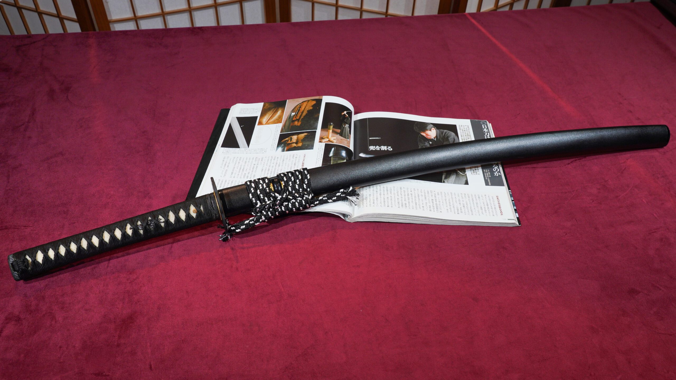 Completing the katana is a black oil lacquered saya fitted with alloy shitodome and a thickened sageo in black and white.