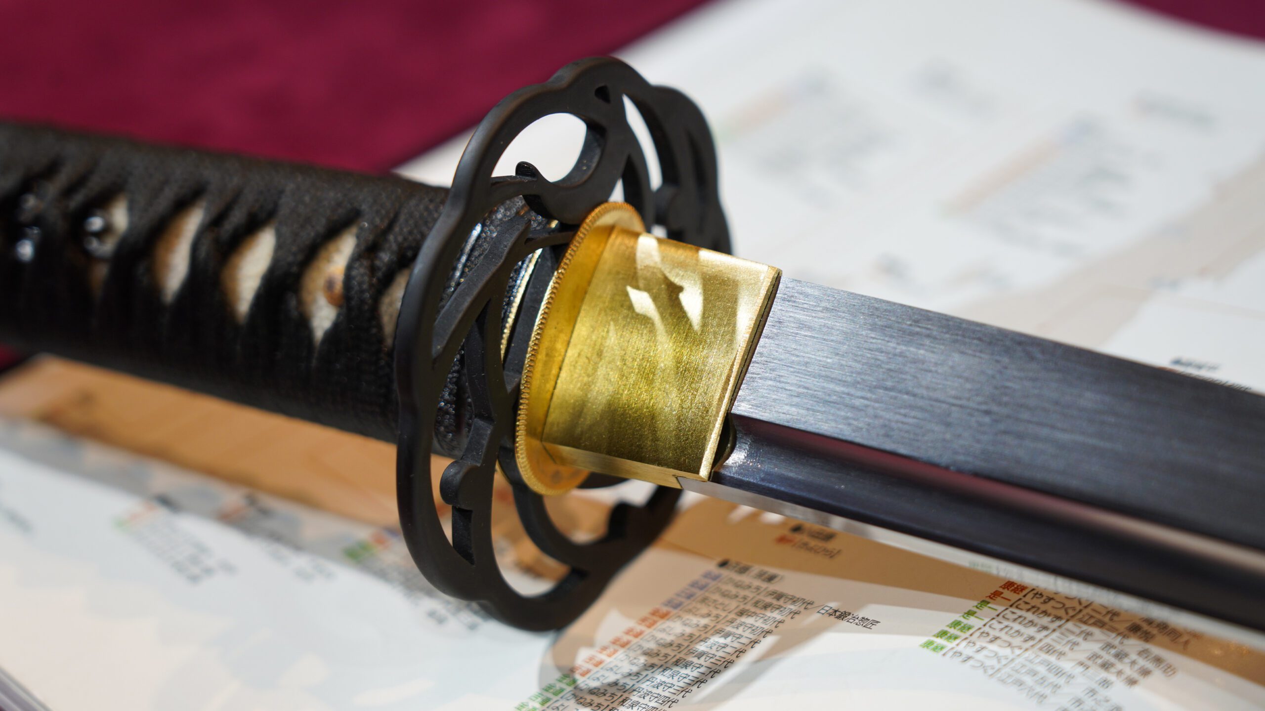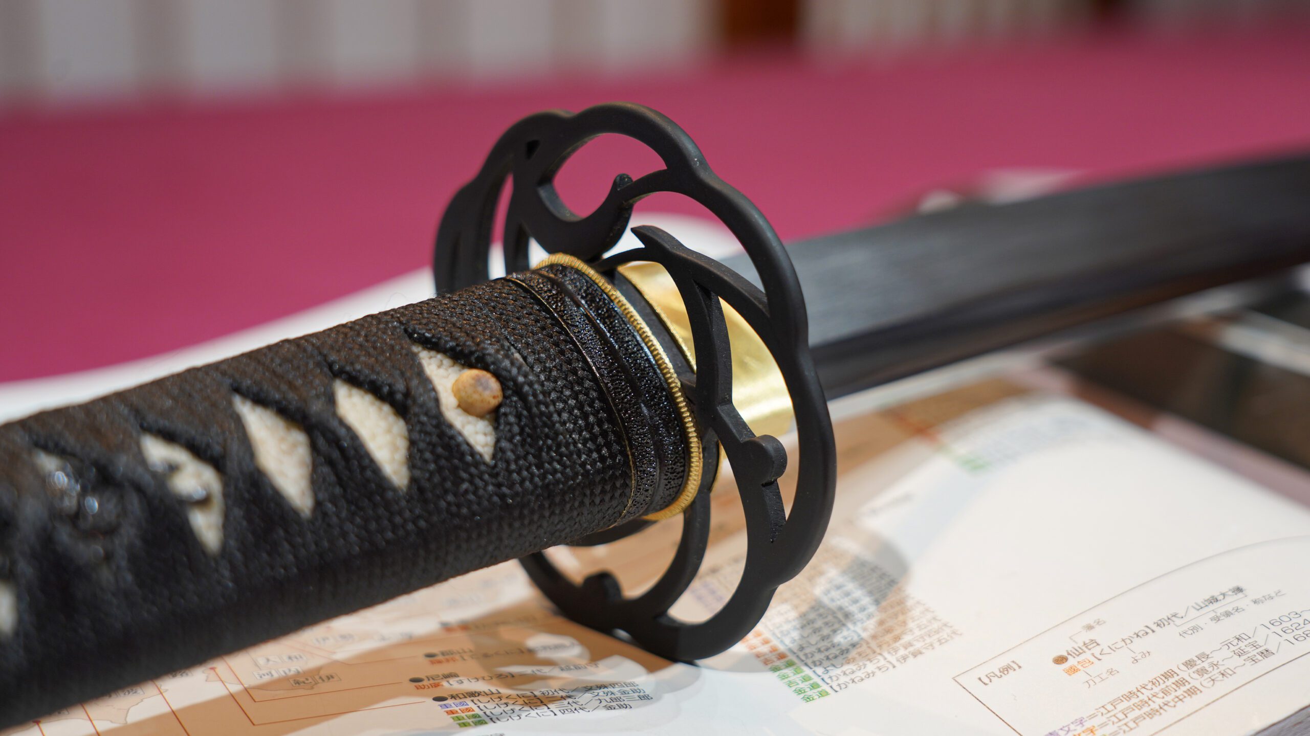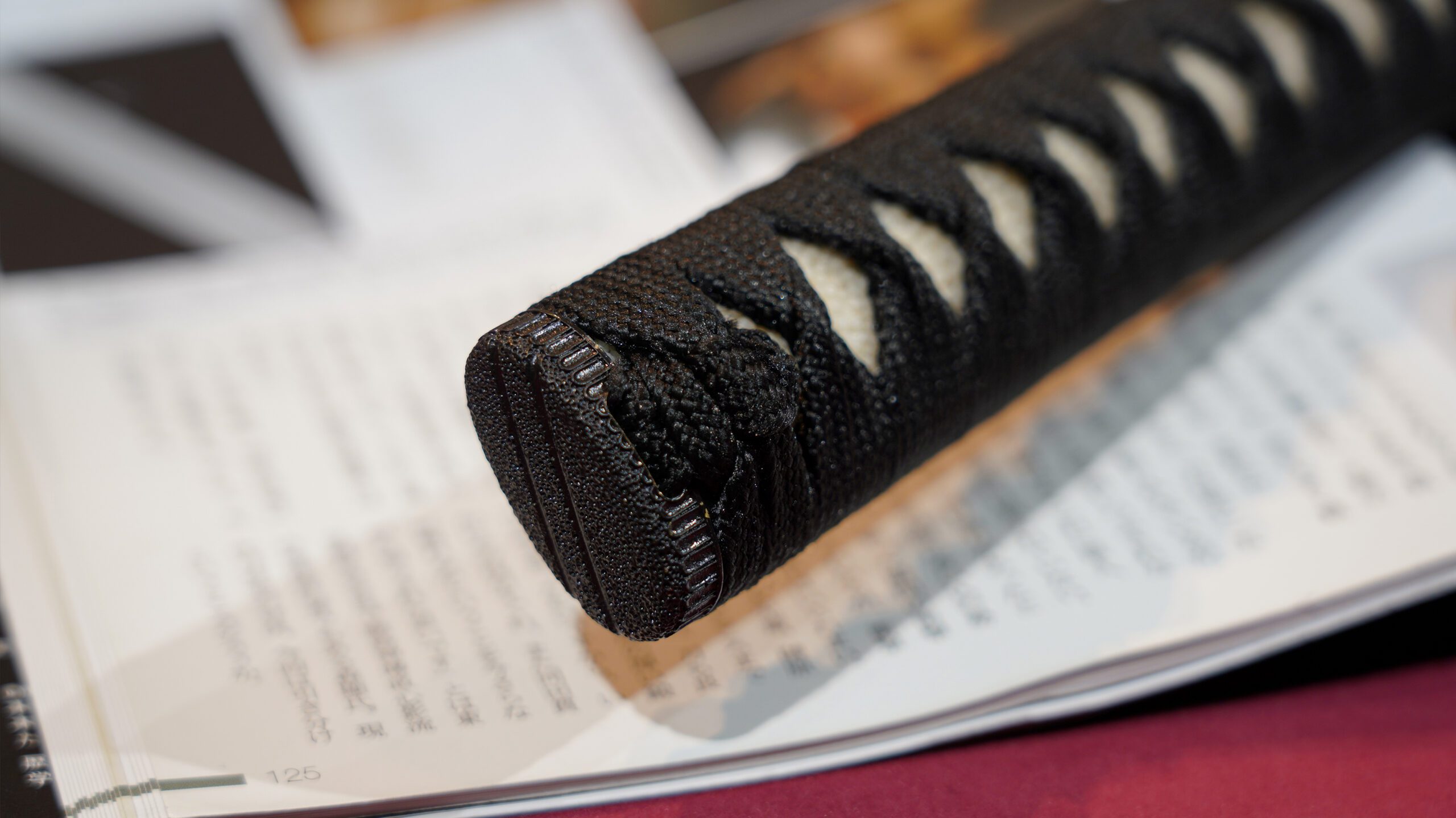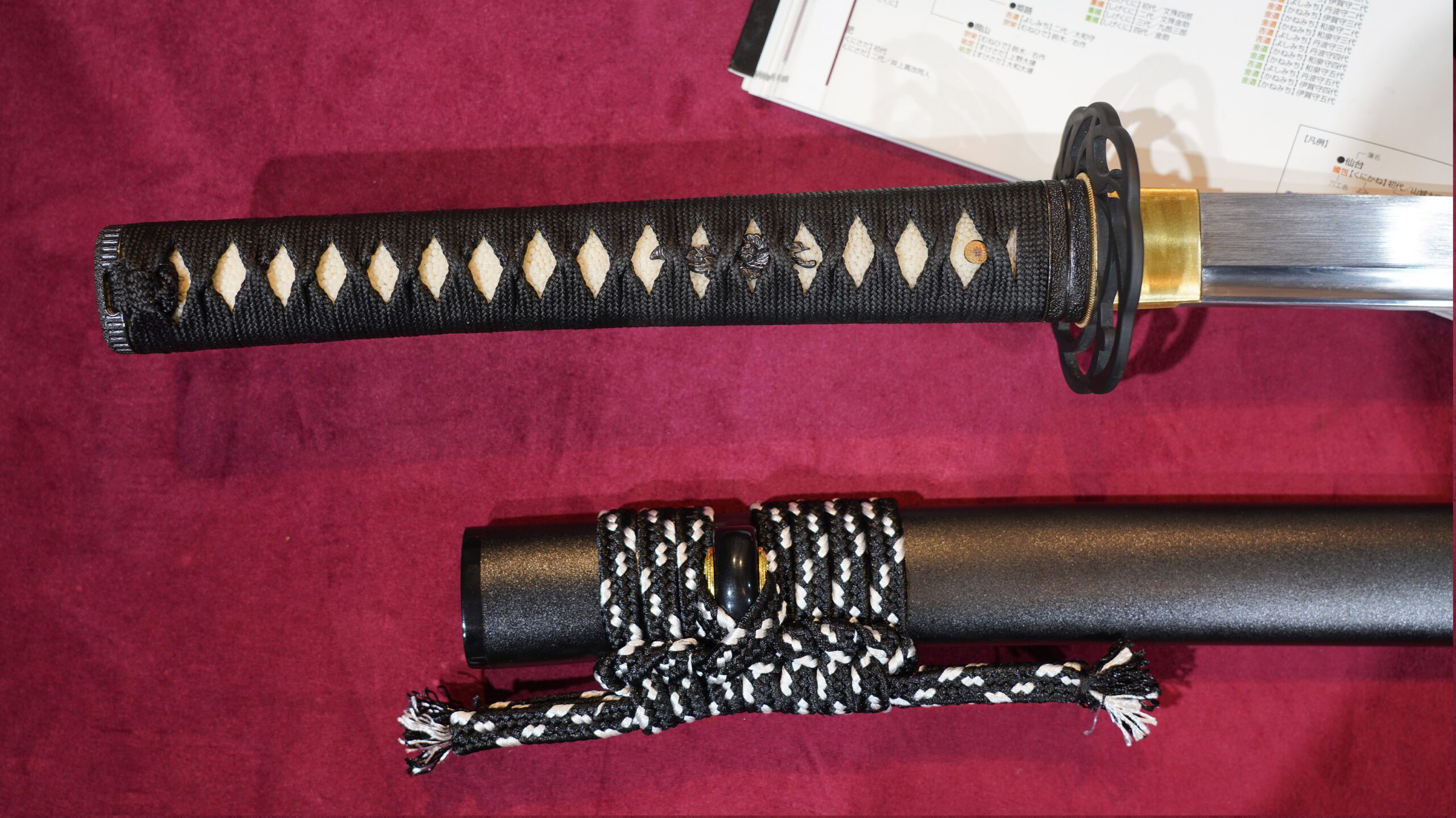 This katana features an elegant blackened iron tsuba, along with brass fuchi, kashira, and menuki that complement the overall design. The blade is secured to the wooden Haichi tsuka with a mekugi, covered with white genuine samegawa, and tightly wrapped with black artificial silk tsuka ito. The handle can include hishigami, small folded paper triangles placed under the tsuka-maki wrap to uphold its shape and provide a firmer grip.