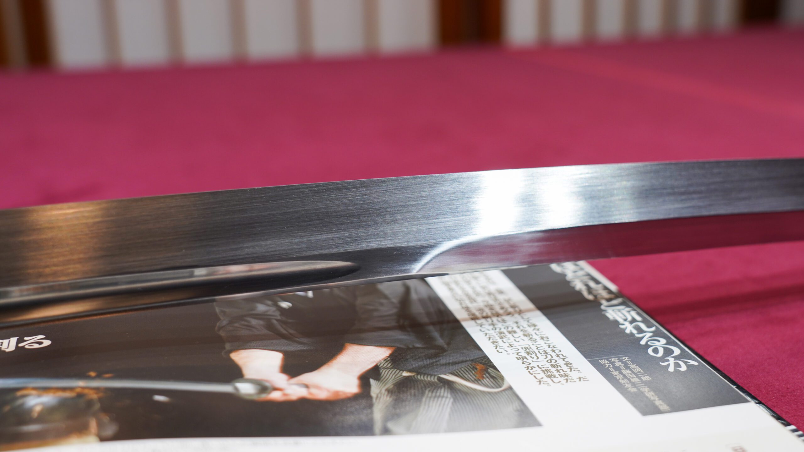 The kanmuri otoshi zukuri blade profile means the thickness on the back gradually thins out from the middle towards the tip, a style often seen in blades from the Yamato province since the Kamakura period which makes it lighter. The bohi groove further lightens the overall weight and improves balance.
