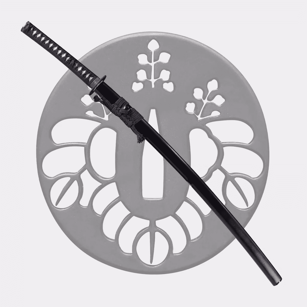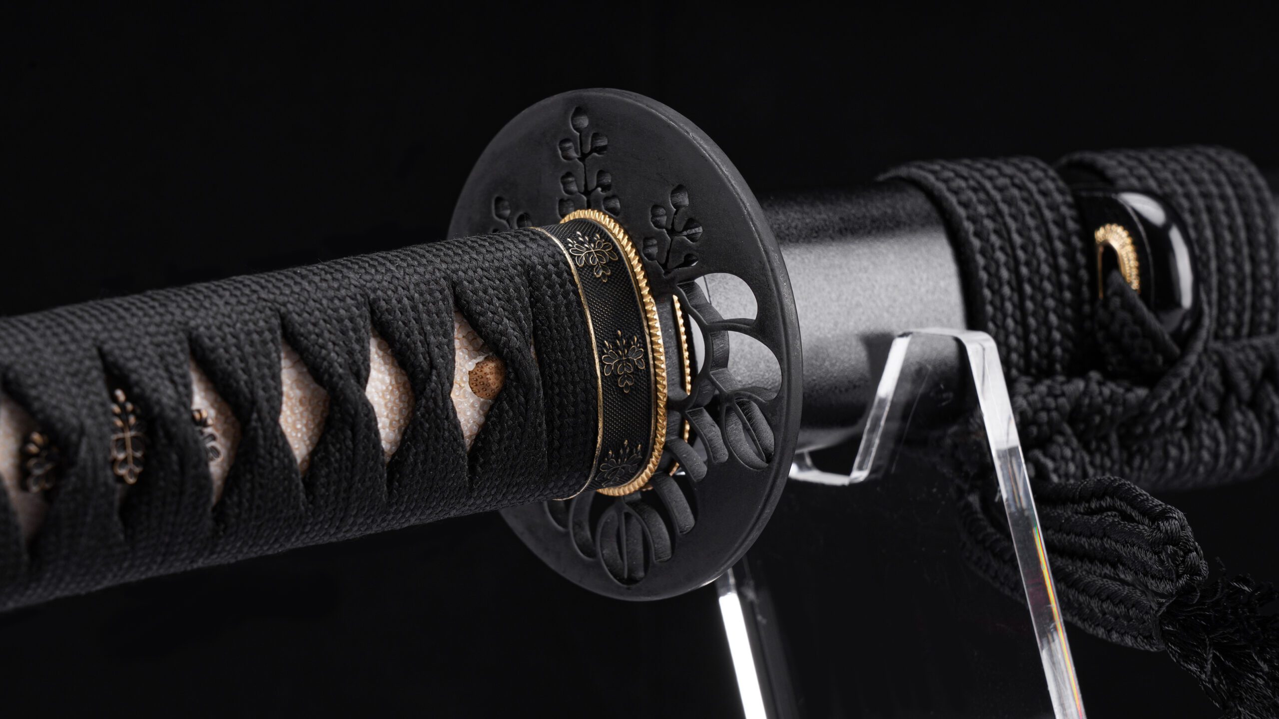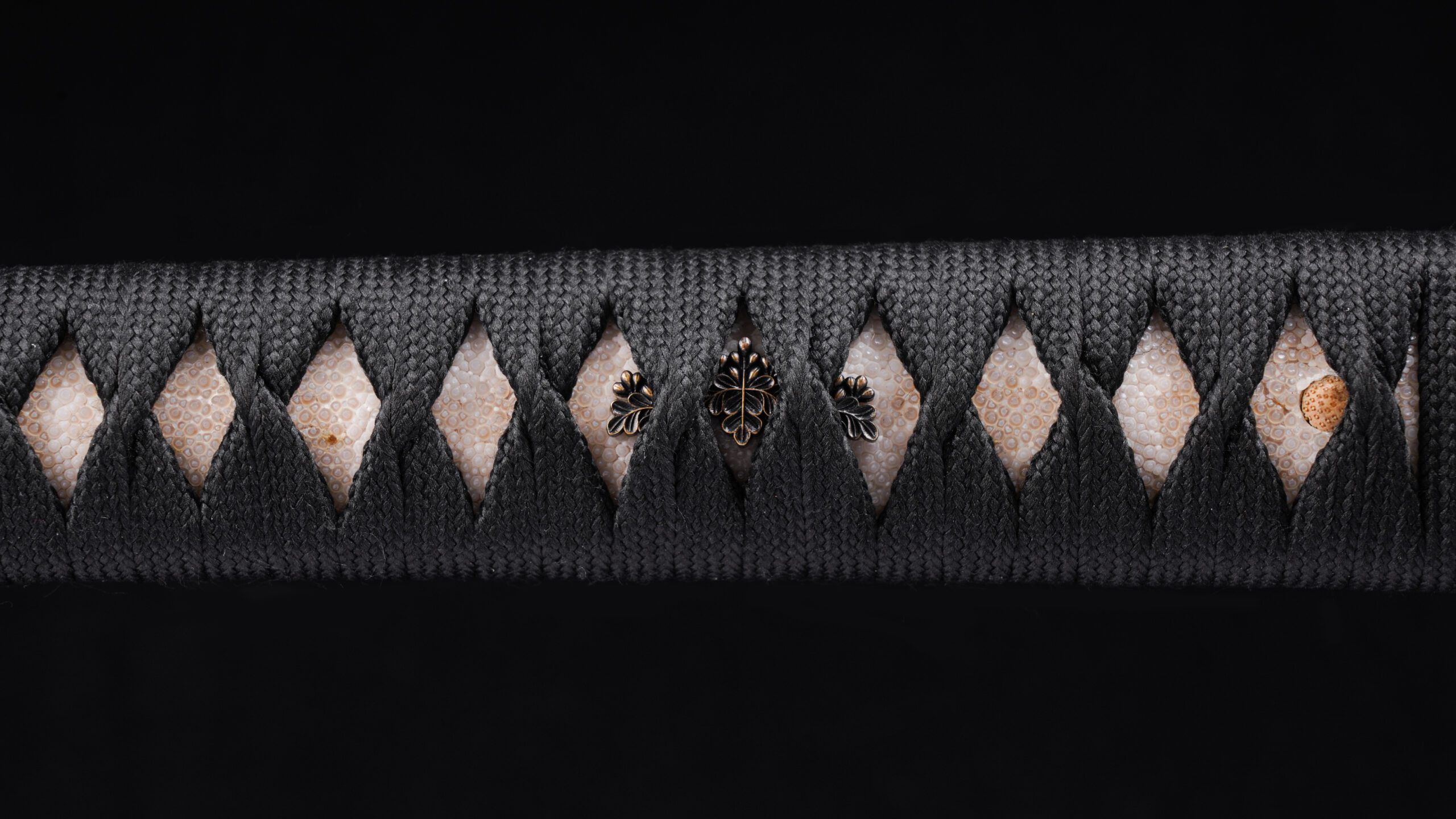 It is then equipped with an iron maru gata (round) tsuba and brass fuchi Kashira that features ornate designs. It also comes with a brass menuki along with brass seppa and habaki. The Haichi style tsuka is first inlaid with white genuine samegawa and wrapped with artificial silk ito. The handle can include hishigami, small folded paper triangles placed under the tsuka-maki wrap to uphold its shape and provide a firmer grip.