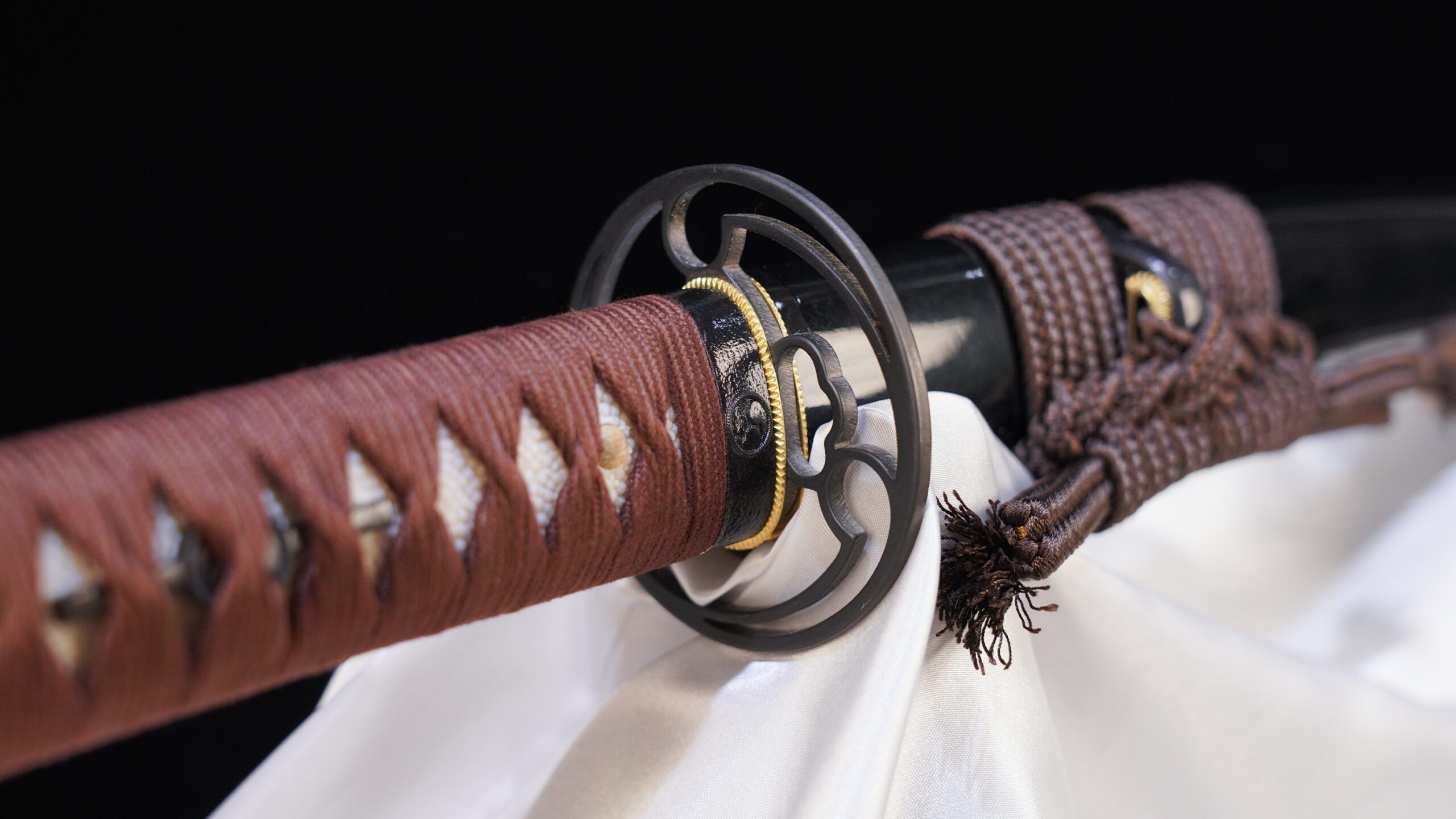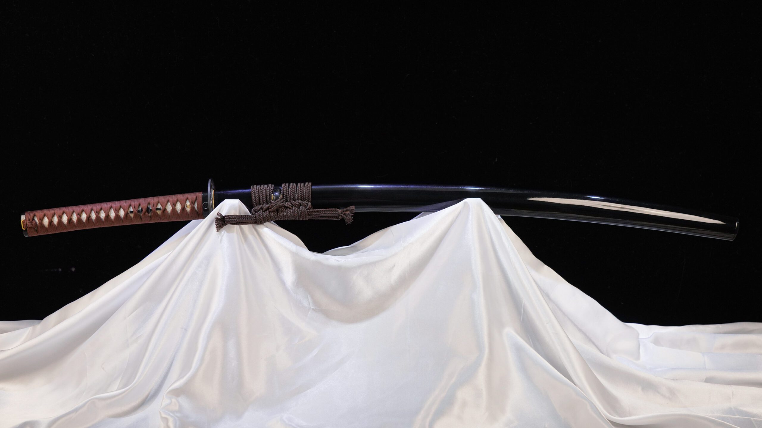 The katana blade is sheathed in an oil lacquered saya mounted with brass shitodome to prevent the Japanese imported rayon sageo from fraying.