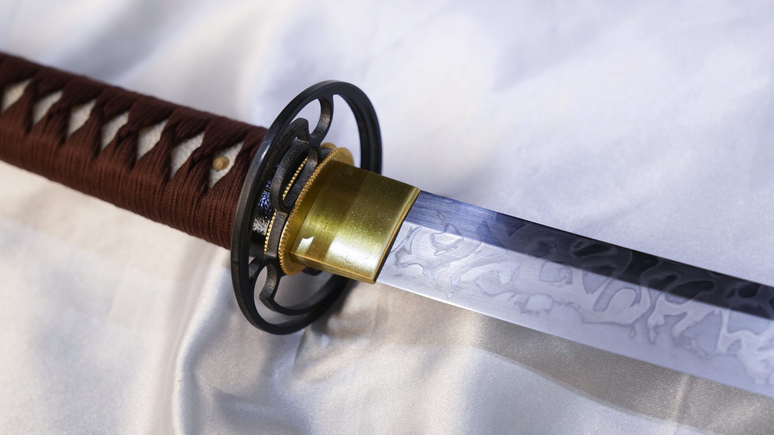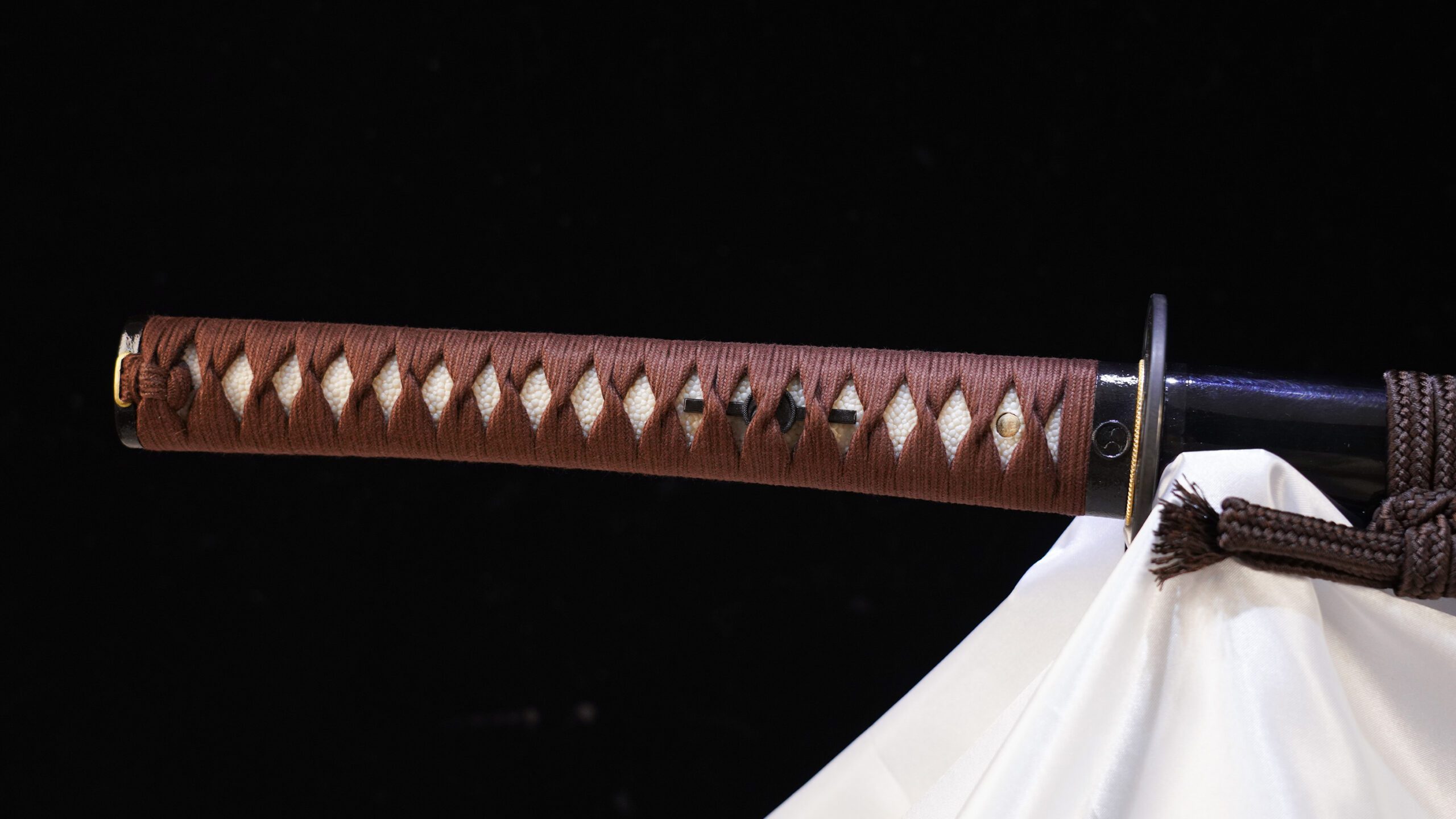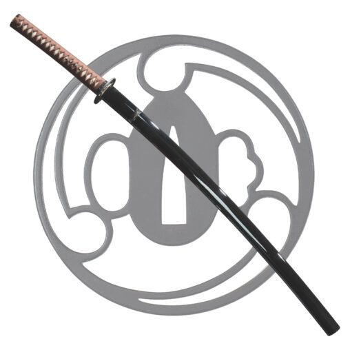 It is equipped with an iron maru gata (round) tsuba along with brass fuchi and kashira that has flower motifs. It also comes with a brass menuki, copper seppa, and habaki. The Haichi style tsuka is covered in white genuine samegawa held in place with cowhide ito. The handle can include hishigami, small folded paper triangles placed under the tsuka-maki wrap to uphold its shape and provide a firmer grip.
