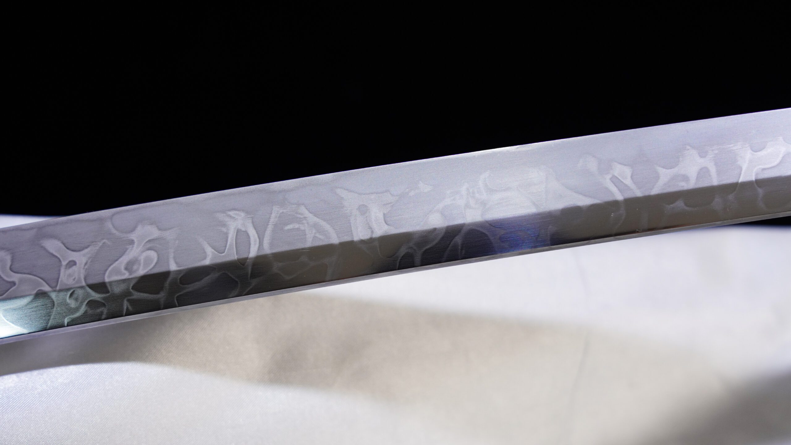This Katana from Shadow Dancer has a shinogi zukuri (curved with yokote and shinogi close to the mune) blade forged from 1095 steel, differentially hardened, clay tempered, and Kesho polished to reveal a beautiful Hitatsura hamon (fully tempered blade with tobiyaki (hardening spots) along the body and spine of the blade). This blade is then secured to the tsuka with a mekugi.