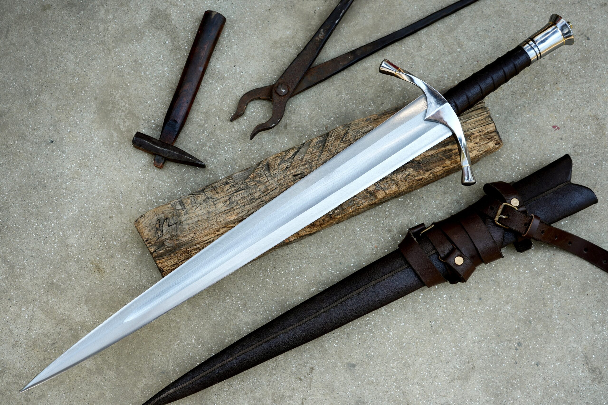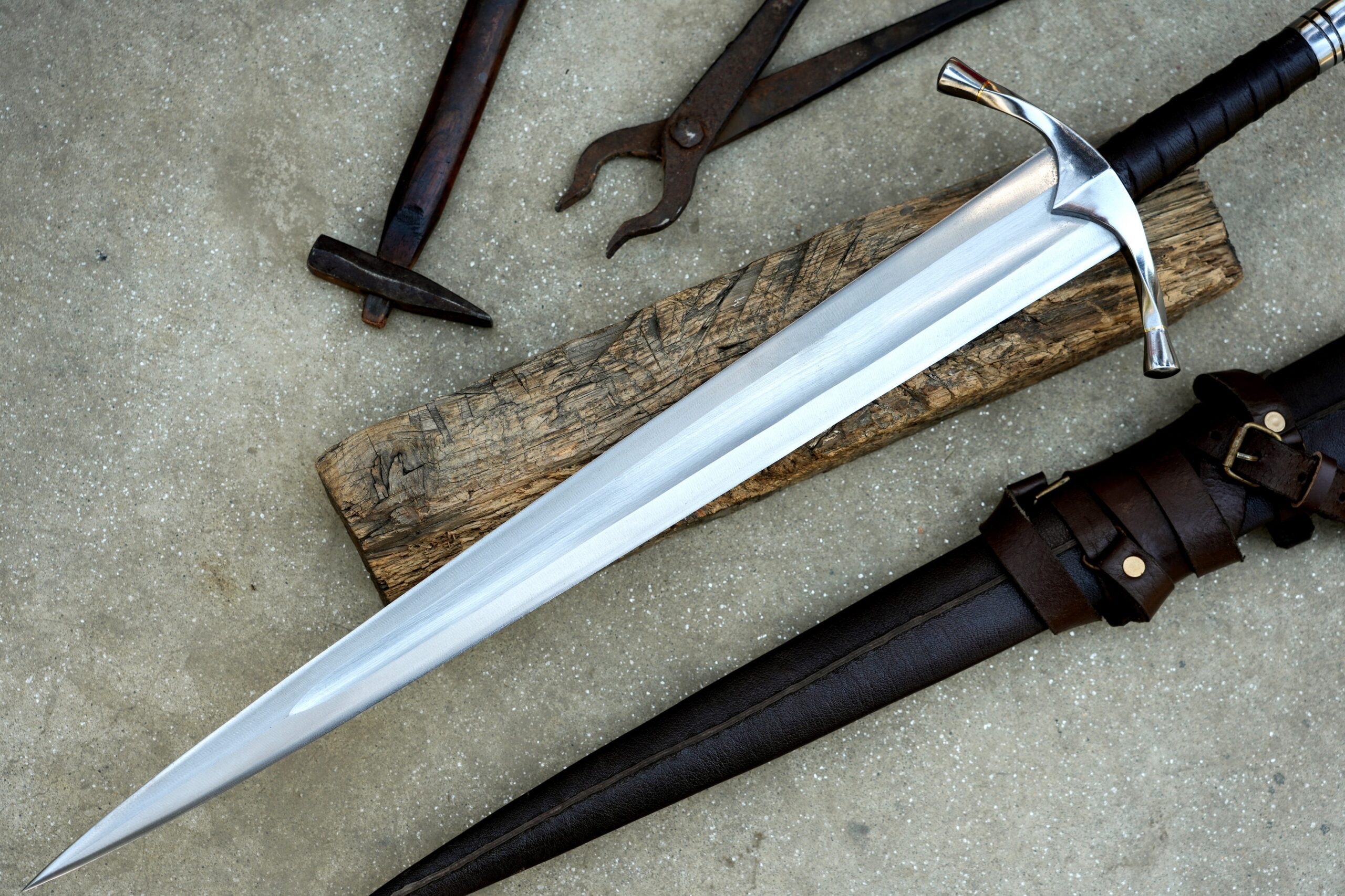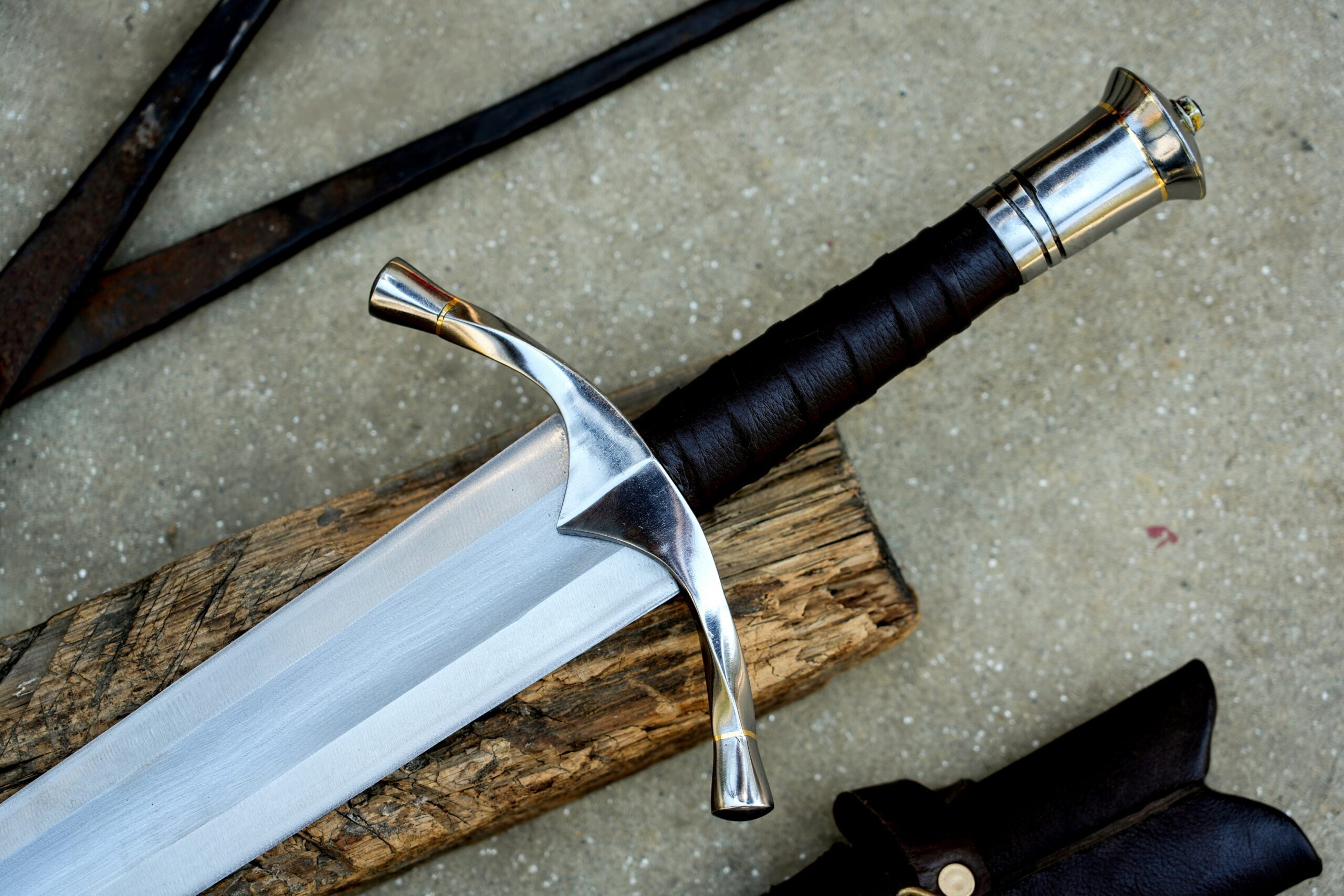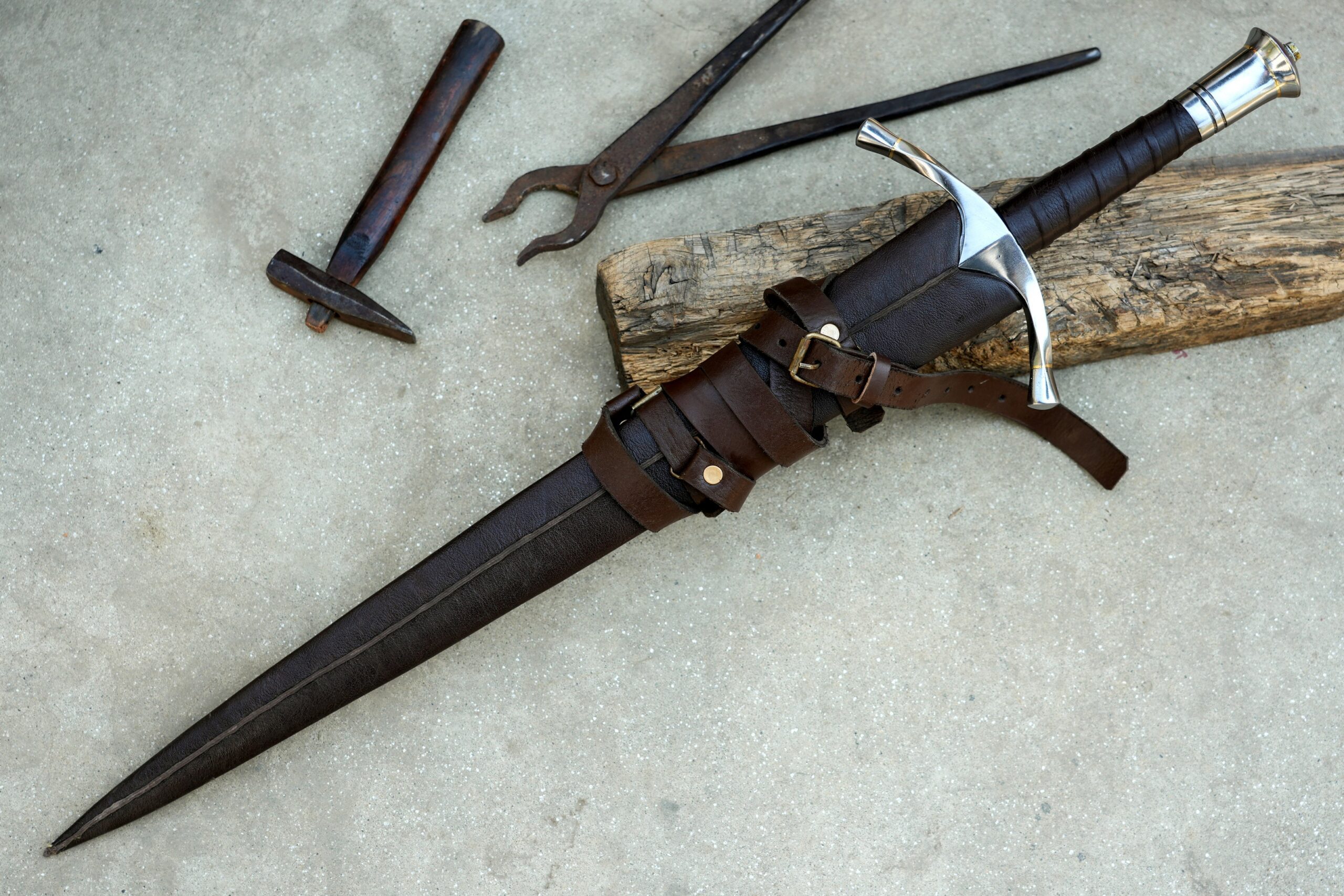 The blade is made from 5160 spring steel, a highly regarded material known for its resilience, flexibility under stress, and resistance to breakage. A historically accurate central fuller runs along the blade, reducing weight while enhancing strength and balance. The pointed tip adds thrusting capability.