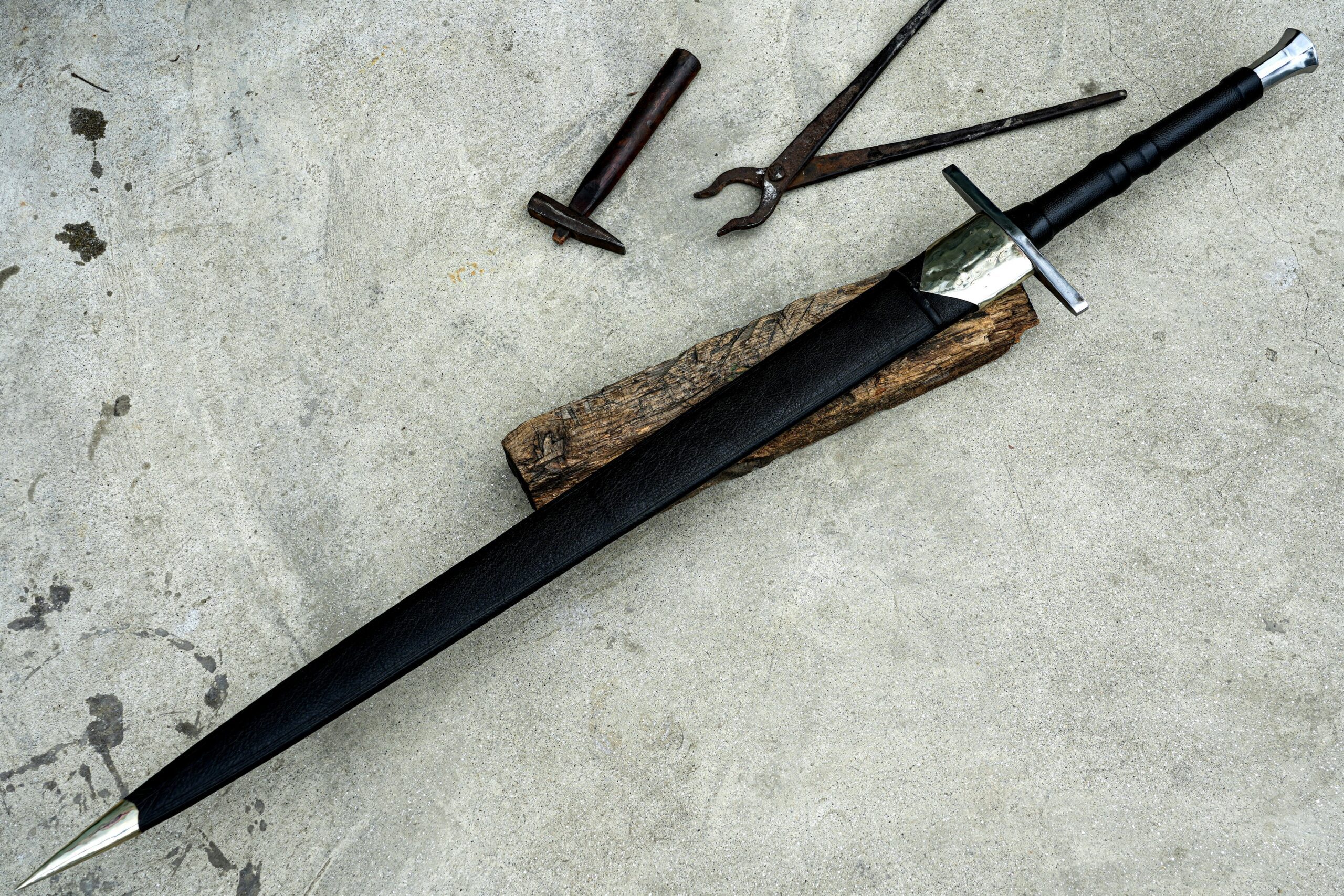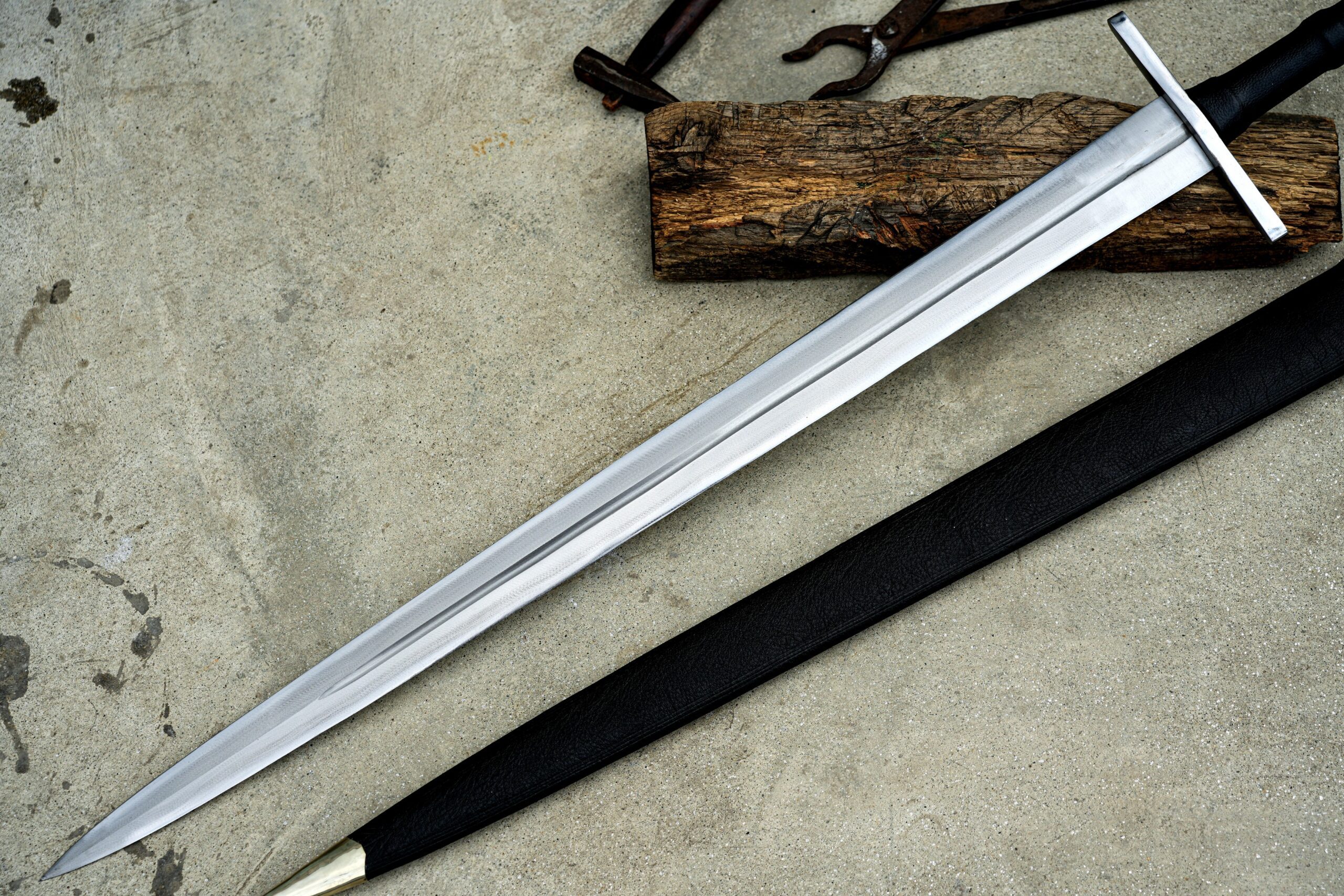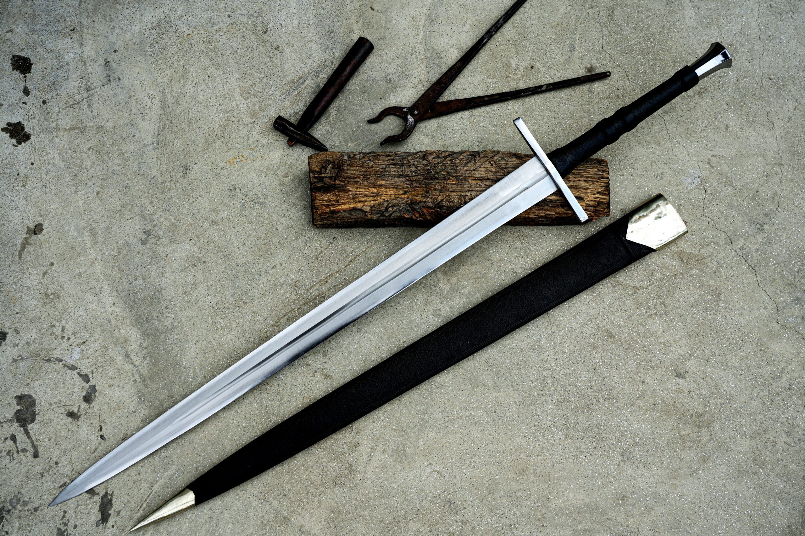 The handle is made of rosewood, wrapped in leather for a secure and comfortable grip. The sword includes a custom leather scabbard for safe storage and presentation.